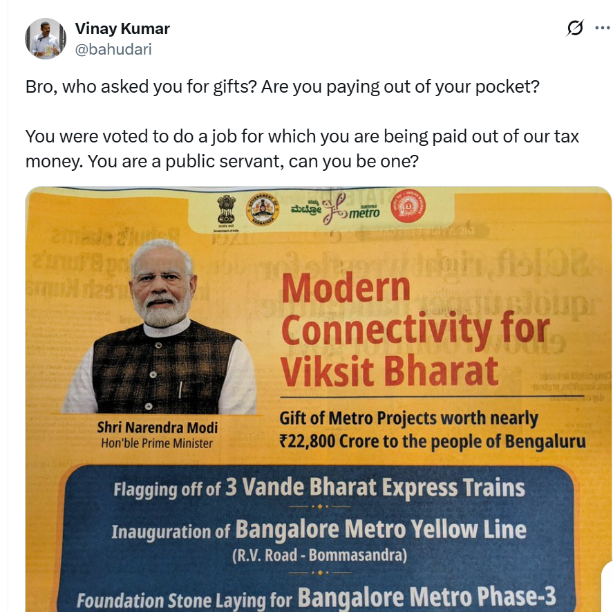 job for which you are being paid out of our tax money. You are a public servant, can you be one?" introduces a critical perspective. Vinay Kumar challenges the framing of these projects as "gifts," arguing that the funds are derived from public taxes, not personal contributions by Modi. This sentiment reflects a broader public discourse about the role of elected officials as public servants rather than benefactors, questioning the narrative of political generosity. The tone suggests frustration with the portrayal of infrastructure development as a favor, rather than a fundamental duty of governance.