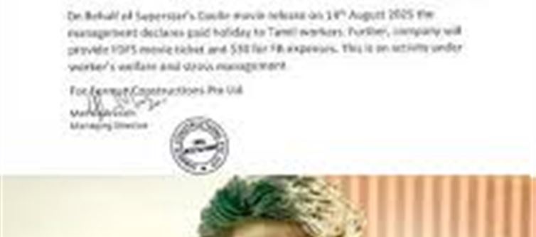 On august 14, a paid holiday was declared for the company. They also bought movie tickets. They also gave money to buy snacks during the interval. The boss who posts a notice board saying, "Enjoy the movie and come to the office the next day, guys." On the occasion of the release of Superstar Rajinikanth's 'Coolie' on august 14, a company has given its employees such an opportunity. Not only that, they are also organizing a food distribution program in orphanages to mark Rajinikanth's 50-year career. Currently, this news has gone viral on social media. The boss of that company is a huge fan of the superstar. That's why they are sending the employees to the theaters after giving them a holiday. They have proven once again that only Rajinikanth has been able to gain such fans. Rajinikanth has such fans not only in india but also abroad.