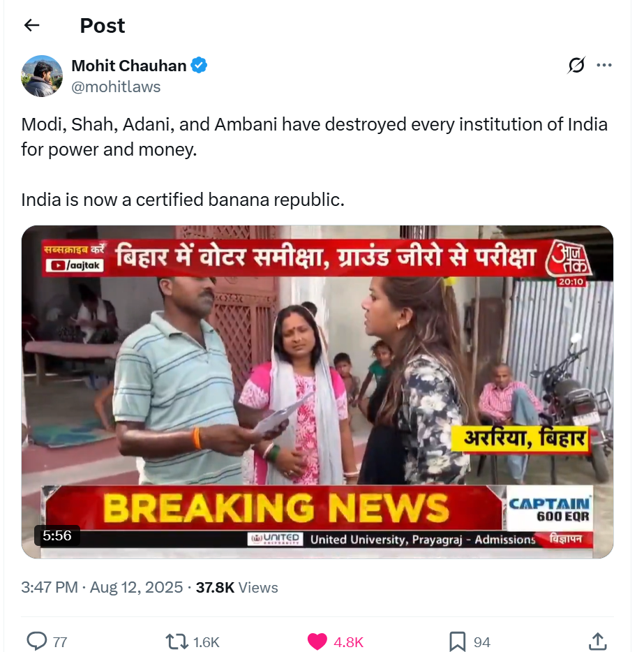 This accusation is encapsulated in Chauhan's tweet, which states, "Modi, Shah, adani, and Ambani have destroyed every institution of india for power and money. india is now a certified banana republic." The term "banana republic" is a pejorative used to describe a politically unstable country with an economy dependent on a single export, often controlled by foreign corporate interests, suggesting a severe critique of governance and institutional integrity.