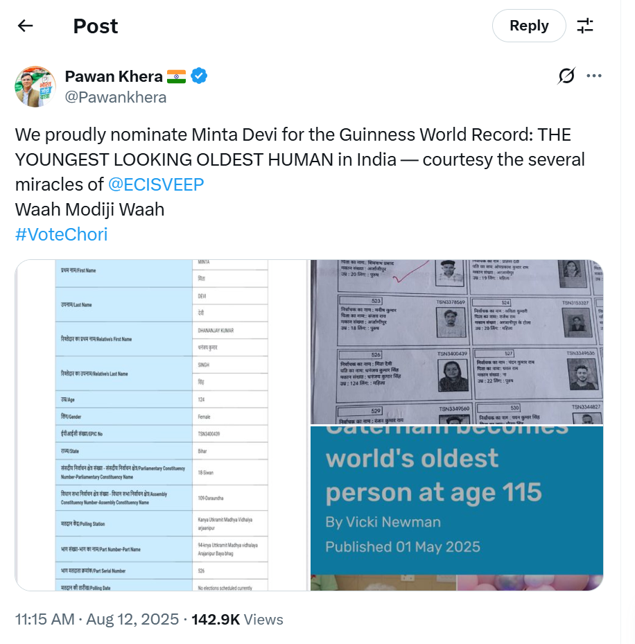 news outlet, highlights Ethel Caterham, the UK's oldest person at 115, as of May 1, 2025, serving as a contrast to underscore the implausibility of a 124-year-old first-time voter. Khera's tweet frames this as a "miracle" attributed to the ECI, accusing the ruling