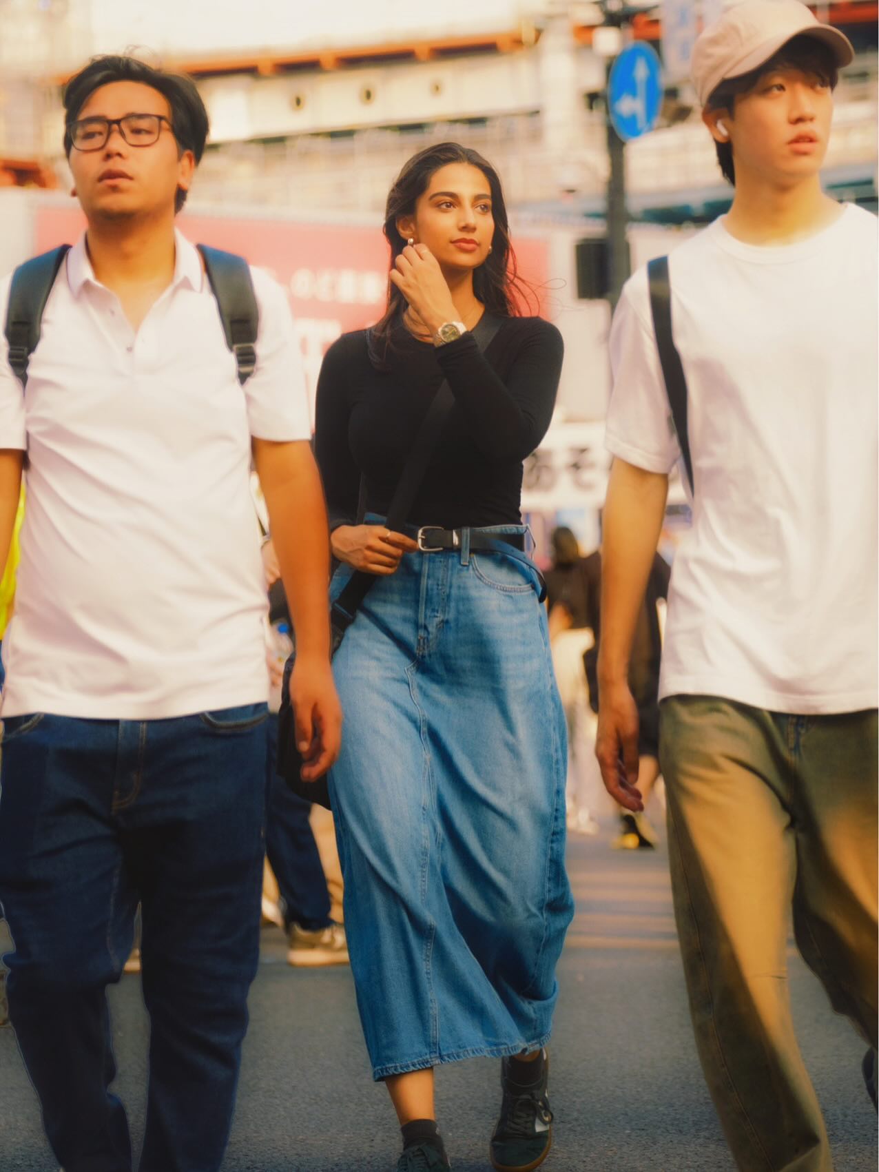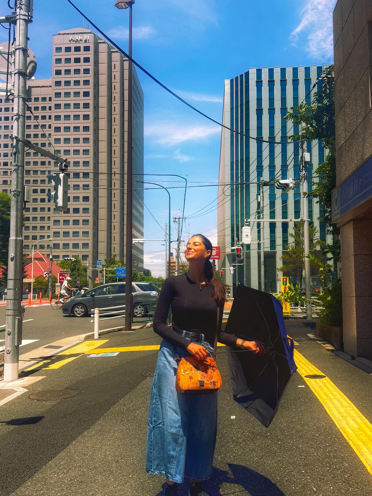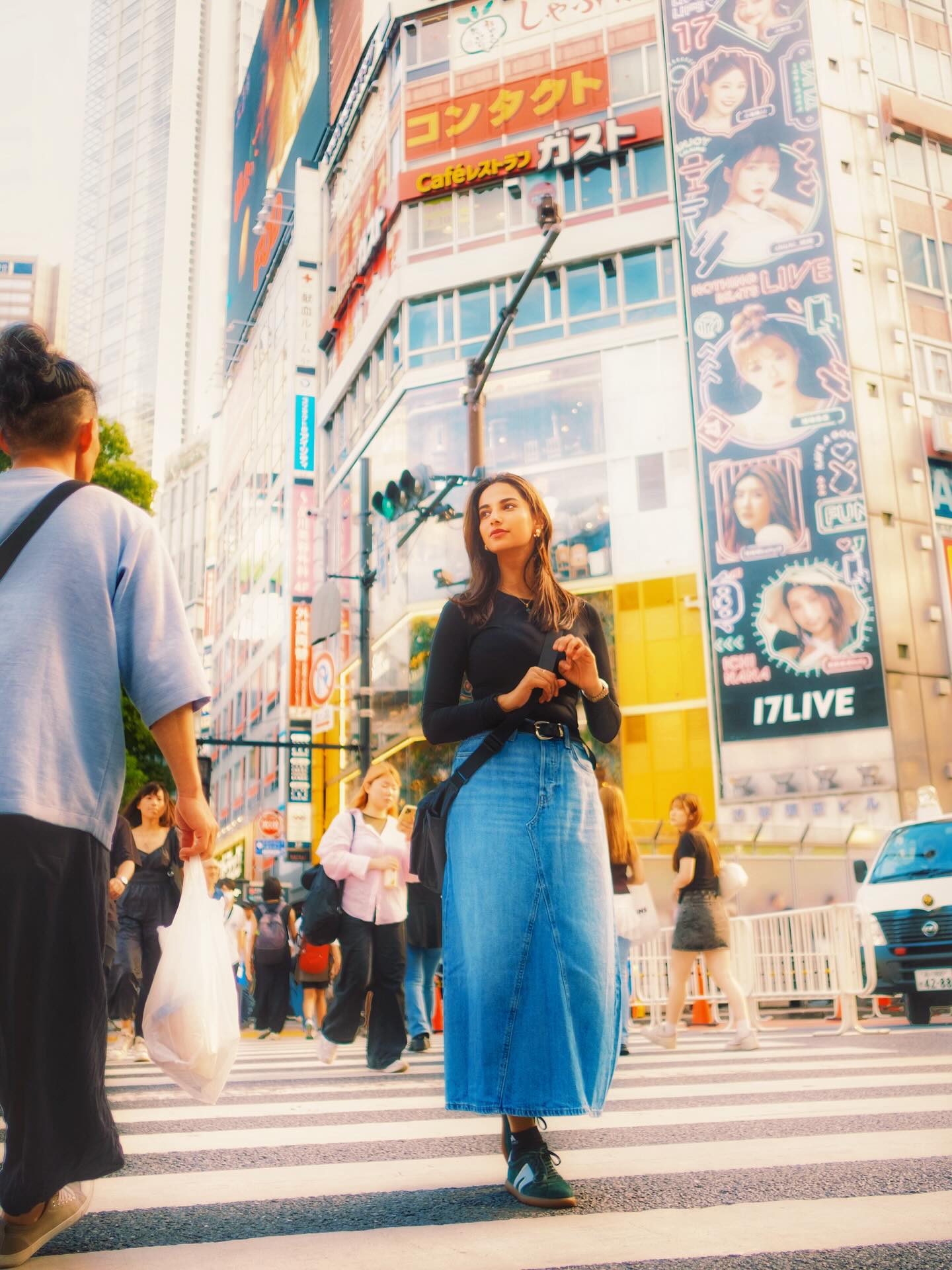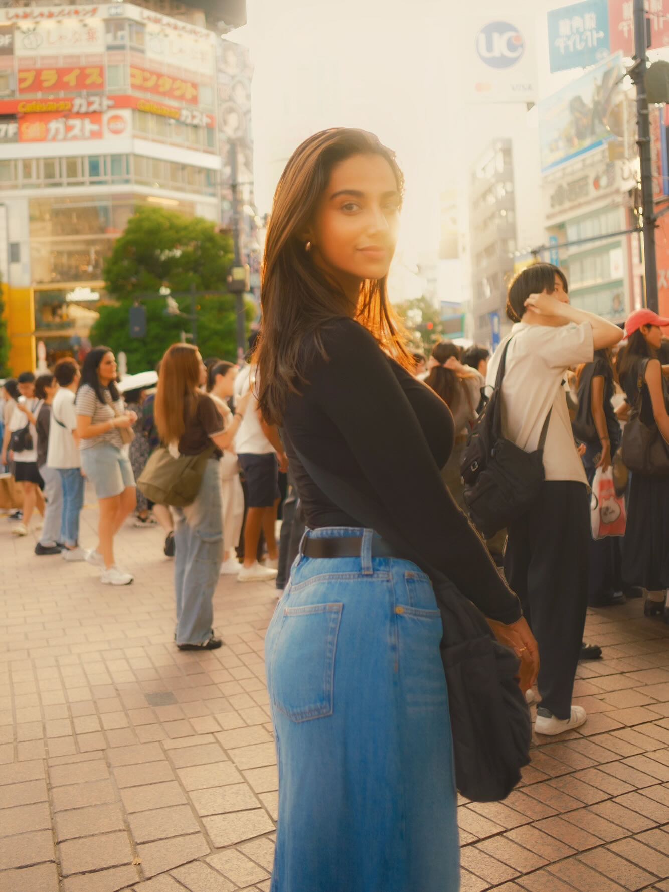 Dressed in a simple black full-sleeve t-shirt paired with a denim skirt and comfy shoes, she carried a casual handbag that added to her effortless style. What truly stood out, however, was her radiant smile and relaxed demeanor, reflecting the joy of being in a city as vibrant and dynamic as Tokyo.