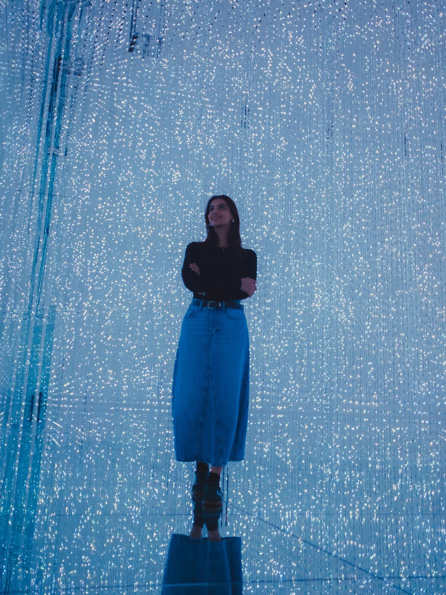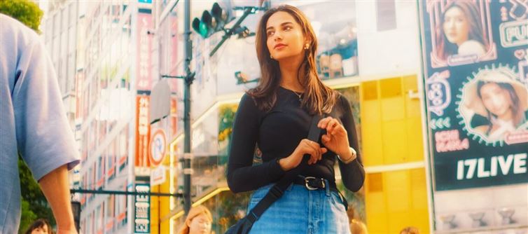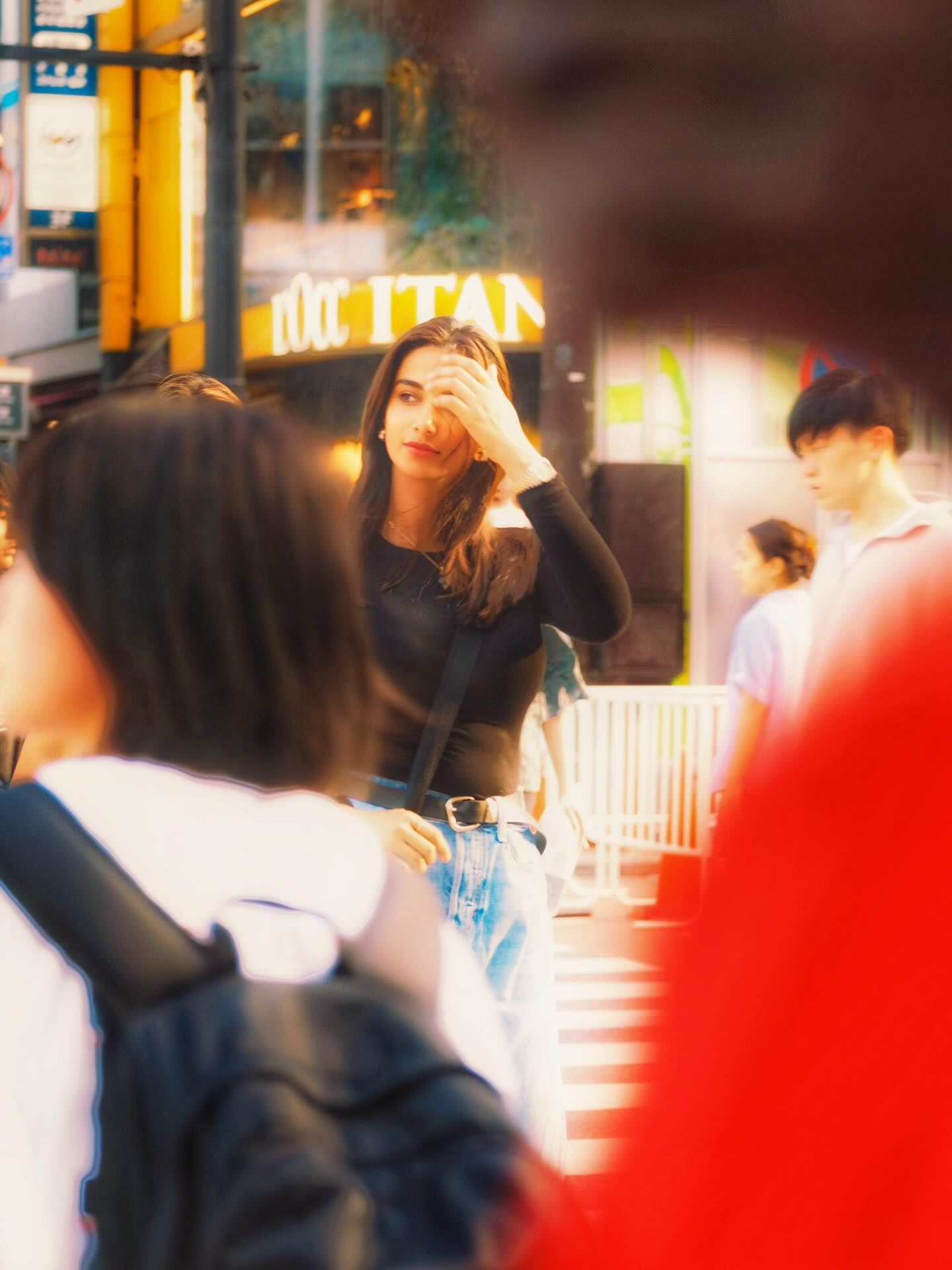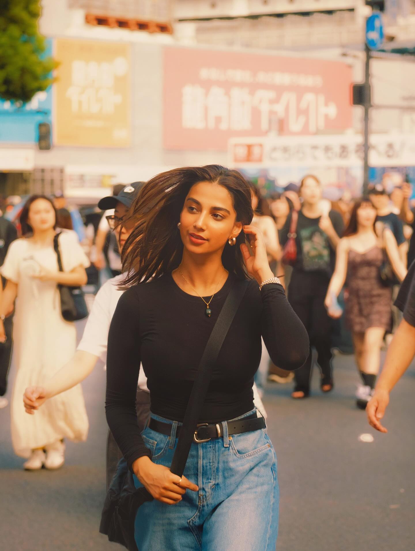 Dressed in a simple black full-sleeve t-shirt paired with a denim skirt and comfy shoes, she carried a casual handbag that added to her effortless style. What truly stood out, however, was her radiant smile and relaxed demeanor, reflecting the joy of being in a city as vibrant and dynamic as Tokyo.