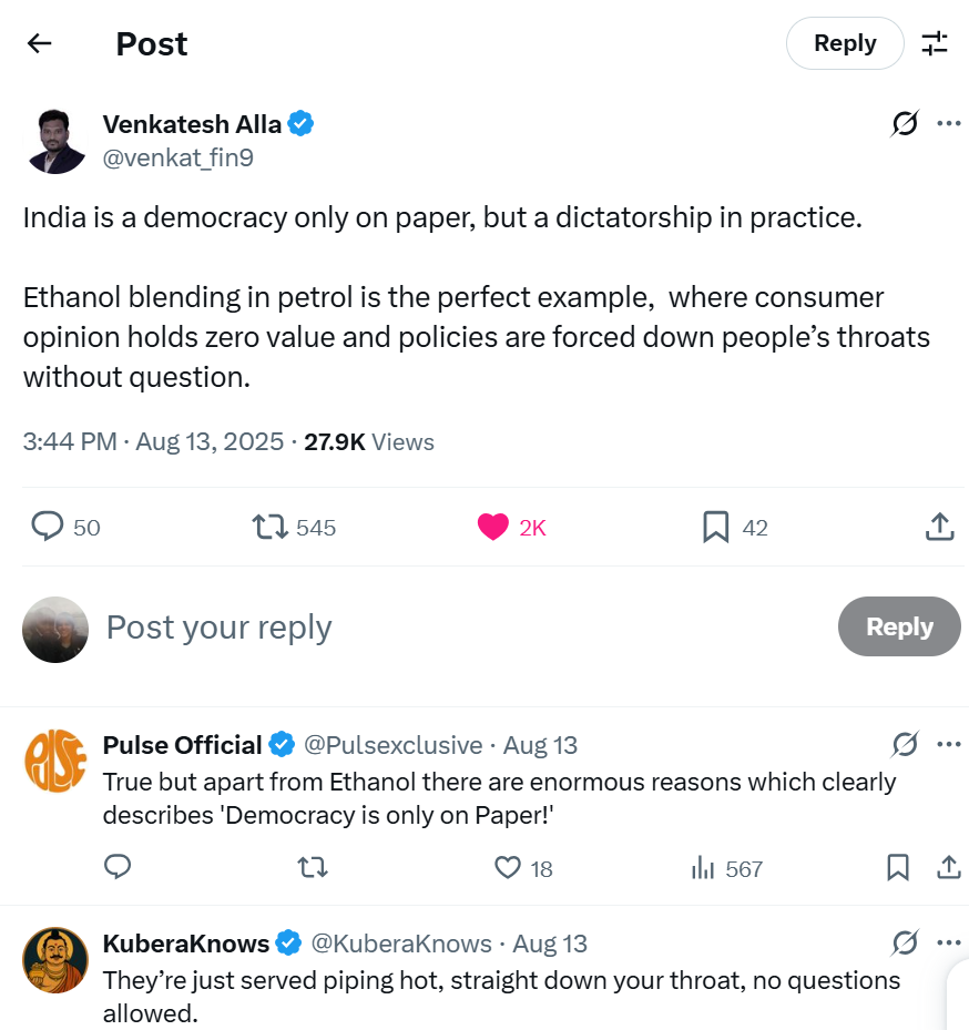 India often takes pride in being the world’s largest democracy, and in theory, the definition fits. We vote, we debate, and we hold elections with great fanfare. But living as a citizen here, I often feel that democracy is reduced to just a word we brandish, not a reality we experience. Policies come at us fully formed, without consultation or discussion, as though the people they affect are incidental. Ethanol blending in petrol is one such glaring example. Across the country, ordinary vehicle owners have complained of mileage drops and disguised cost hikes, yet these concerns vanish into thin air. The government insists on calling it reform, but for us, it feels like a forced choice—one where our opinions count for nothing.