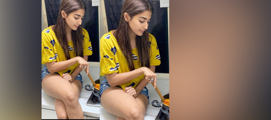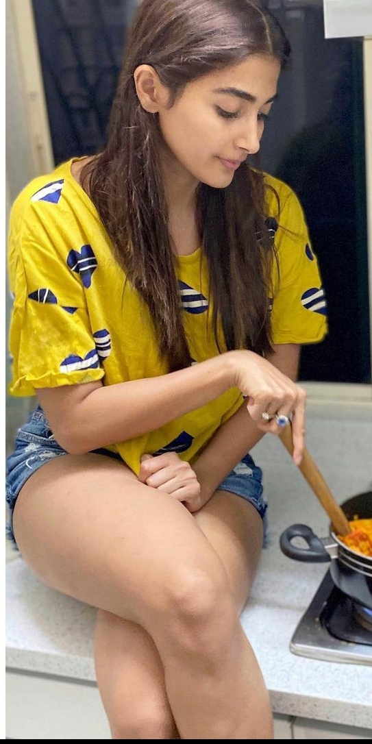 pooja hegde is seen in a relaxed and homely avatar, cooking in her kitchen. Dressed in a bright yellow printed T-shirt paired with casual denim shorts, she radiates a breezy, girl-next-door charm. The simplicity of her attire reflects comfort and ease, making her look instantly relatable to her fans. Her natural, no-makeup appearance further