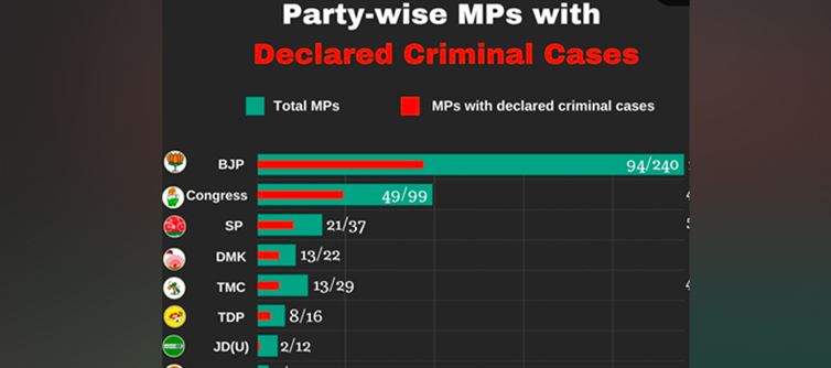 A striking infographic shared by @IndianGems_ on X has brought attention to the number of indian Members of parliament (MPs) with declared criminal cases, categorized by political party. The chart highlights the bharatiya janata party (BJP) leading with 94 out of its 240 MPs facing such cases, a significant portion that raises eyebrows about the party’s representation. The congress party follows with 49 out of 99 MPs, while the Samajwadi party (SP) has 21 out of 37, showcasing a notable trend across major political entities as of this morning.