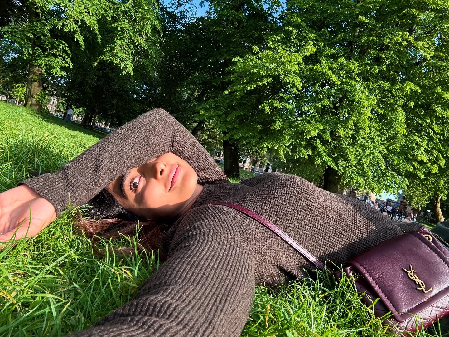 The simplicity of her attire—a cozy dark knit top paired with a delicate chain—adds to the relaxed and intimate vibe of the picture. Sunlight gently highlights her features, enhancing the warmth in her smile and reflecting a carefree, serene mood. For fans, this glimpse into her softer, unguarded moments offers a refreshing contrast to the high-fashion images she often shares on social media.