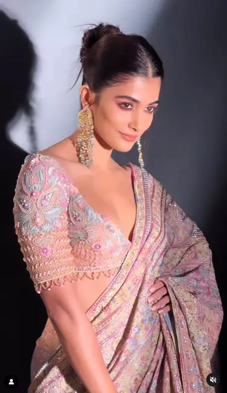 pooja turned heads with a deep V-neck blouse, pairing it with a pastel saree that balanced elegance with boldness.