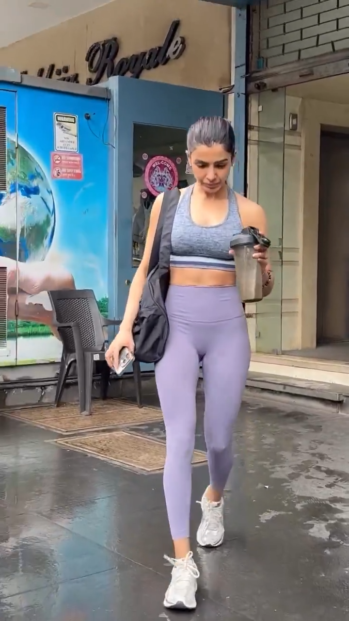 sports bra paired with lavender high-waist leggings, flaunting her toned physique. Her effortless style showcased not just her
