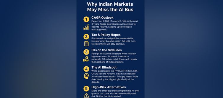 👉 Bottom Line: India’s markets may remain resilient but underwhelming in USD terms unless the AI gap is bridged. Long-term investors might need to look abroad for true AI-driven wealth creation.