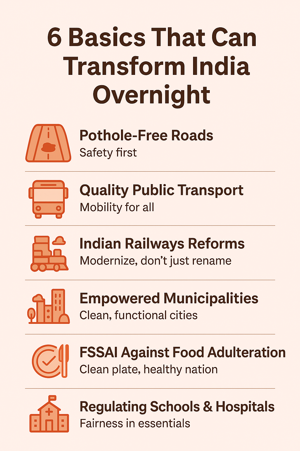 india doesn’t need miracles to change—it just needs the basics done right. Citizens aren’t asking for luxuries; they’re asking for a country where roads are safe, trains are reliable, food is clean, and schools and hospitals don’t fleece them. These six simple reforms could transform india into the nation we all dream of: