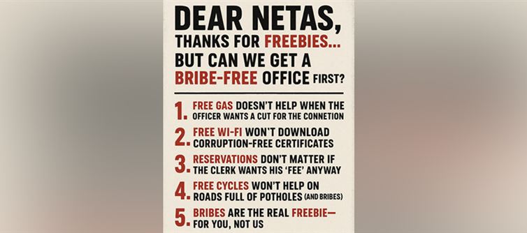 You love to shower us with freebies—cycles, TVs, gas cylinders, even Wi-Fi. But here’s a small, humble request from the very citizens who pay for all your drama: can we, for once, get a bribe-free government office?