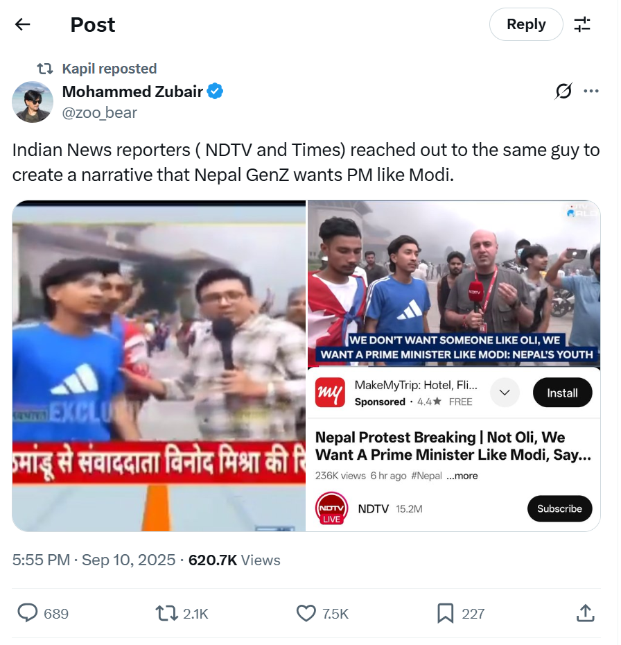 “One Modi Fan, Two Channels, Infinite Propaganda: How Godi media Turns Nepal’s Protests Into a Modi PR Show”