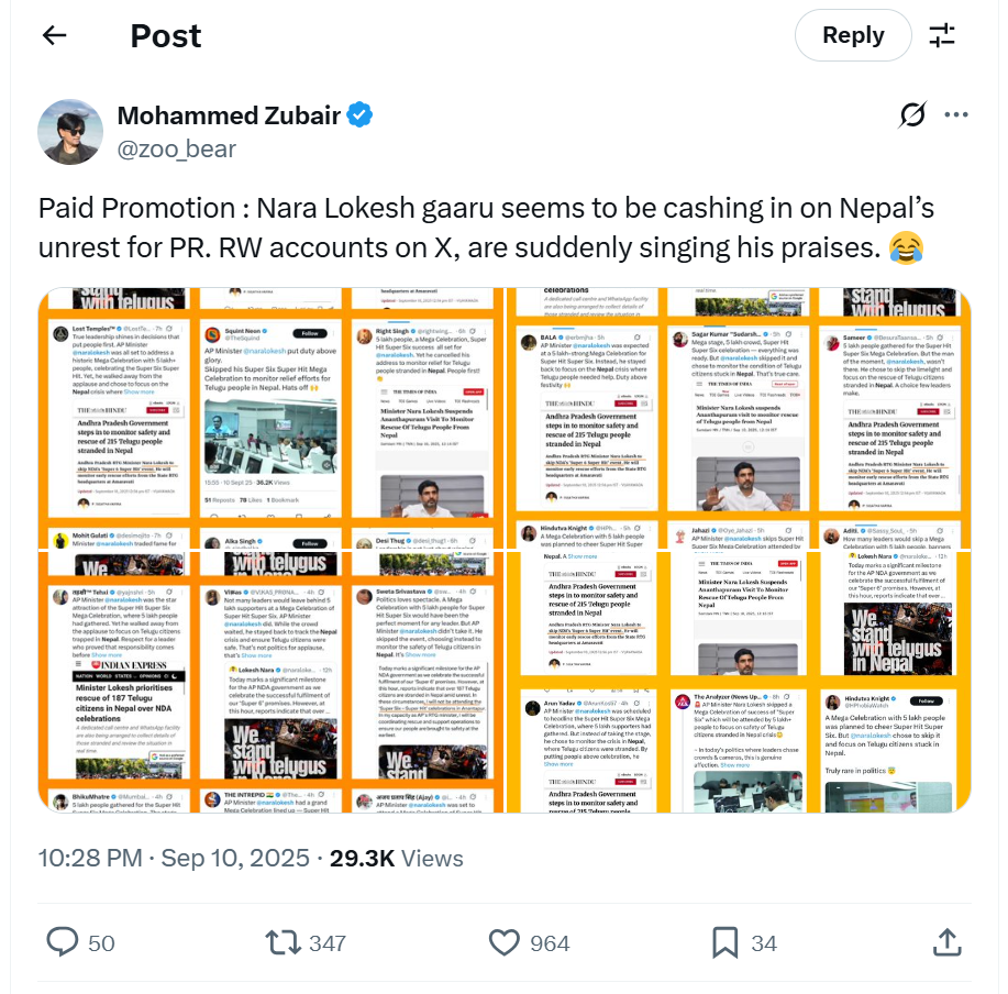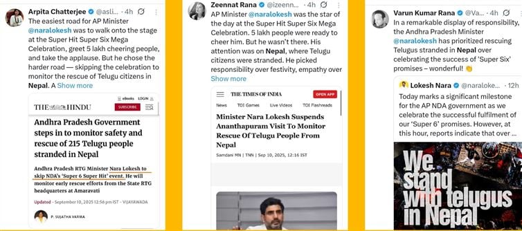 Reports suggest that lokesh made a phone call during Nepal’s unrest. Instead of being a private act of concern, it was transformed into a publicity spectacle, complete with social media amplification and praise from RW accounts. Tragedy is being monetized for optics.