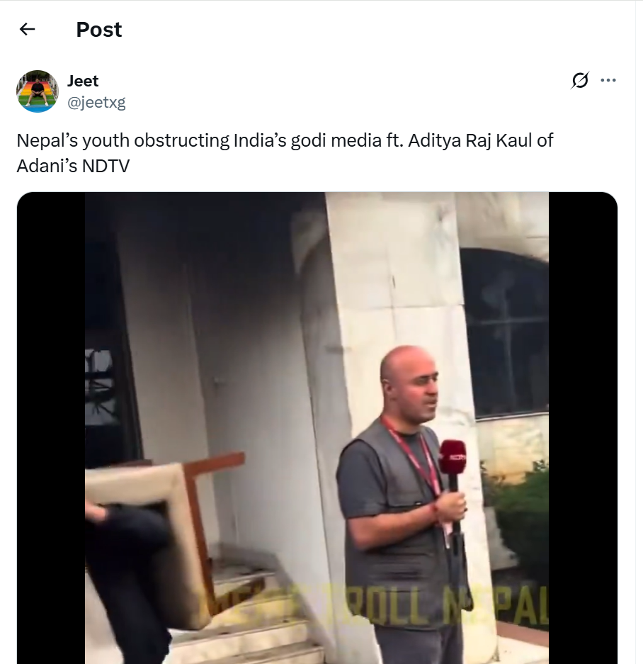 When it comes to selling propaganda, India’s godi media has mastered the art of twisting facts. But in nepal, the playbook didn’t work. Led by Aditya raj Kaul of Adani-owned NDTV, a shameless attempt to manufacture consent for Modi-style politics was brutally exposed by Nepal’s youth. What unfolded is not just embarrassment — it is a new low for indian media credibility.
