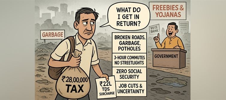 Every year, India’s salaried middle class bleeds crores into government coffers, only to be rewarded with potholes, pollution, and political gimmicks. In 2025, one taxpayer shelled out a staggering ₹28,00,000 in taxes—₹22 lakh via TDS plus surcharges, and the rest in extras. What did they get in return? Let’s count the insults: