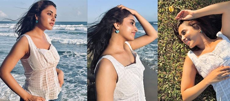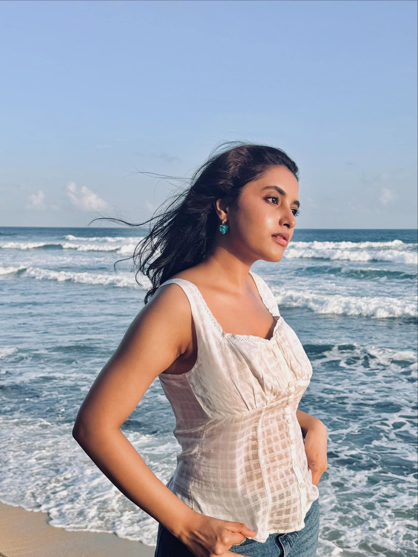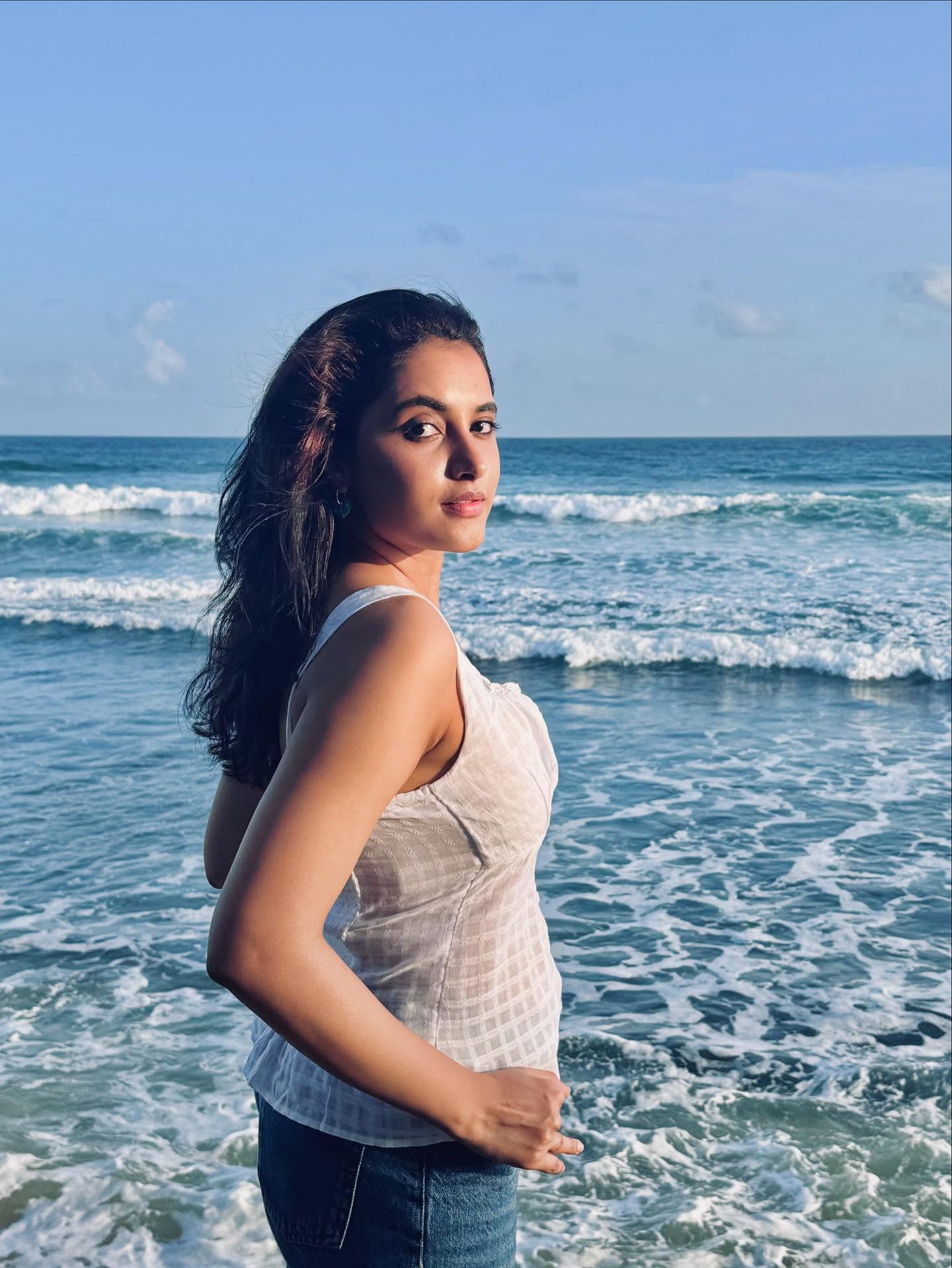 The serene sea backdrop contrasts with her intensity, creating a cinematic frame. It’s more than a photo—it’s a story in motion, capturing contemplation and charisma in one shot.