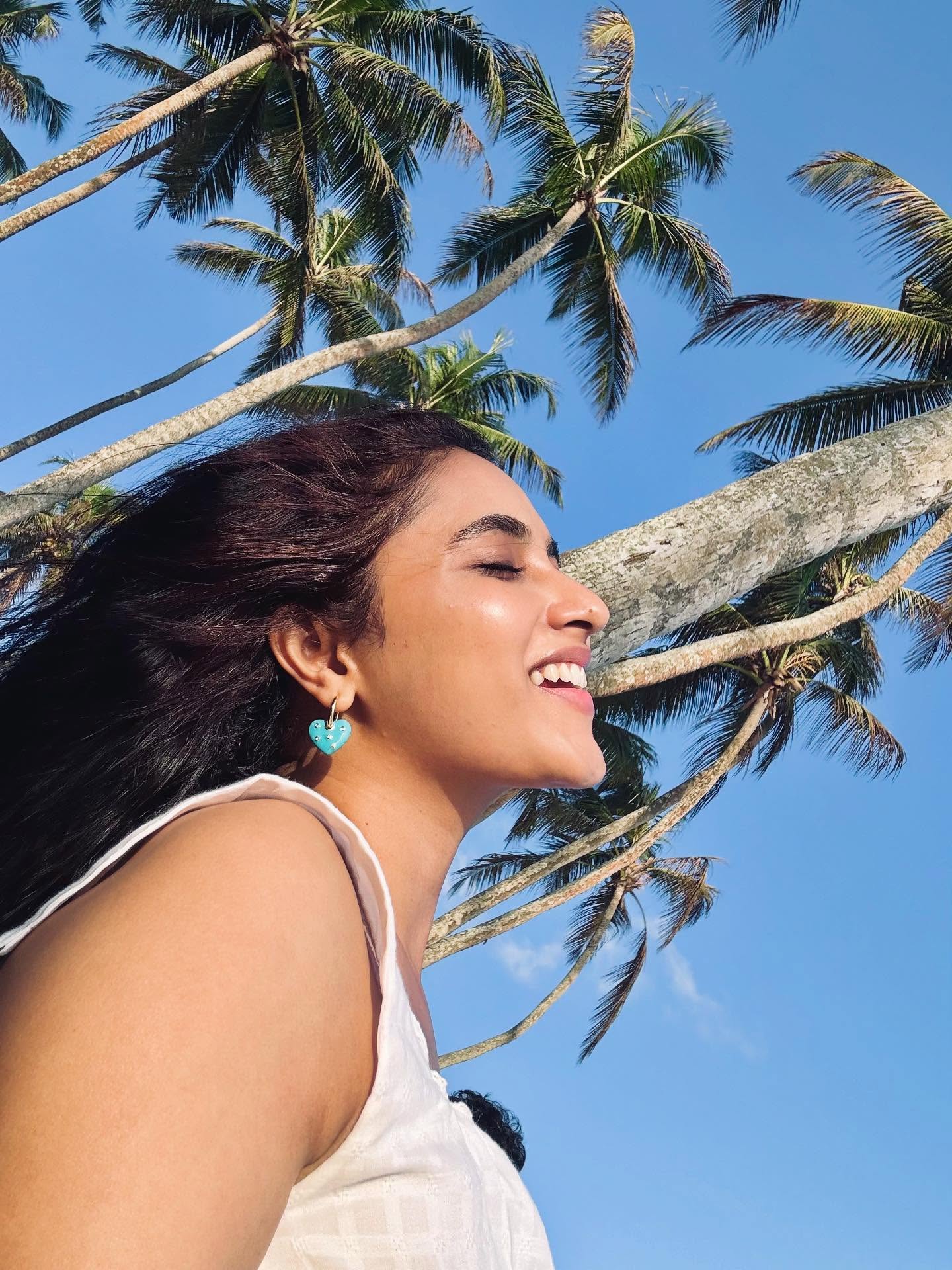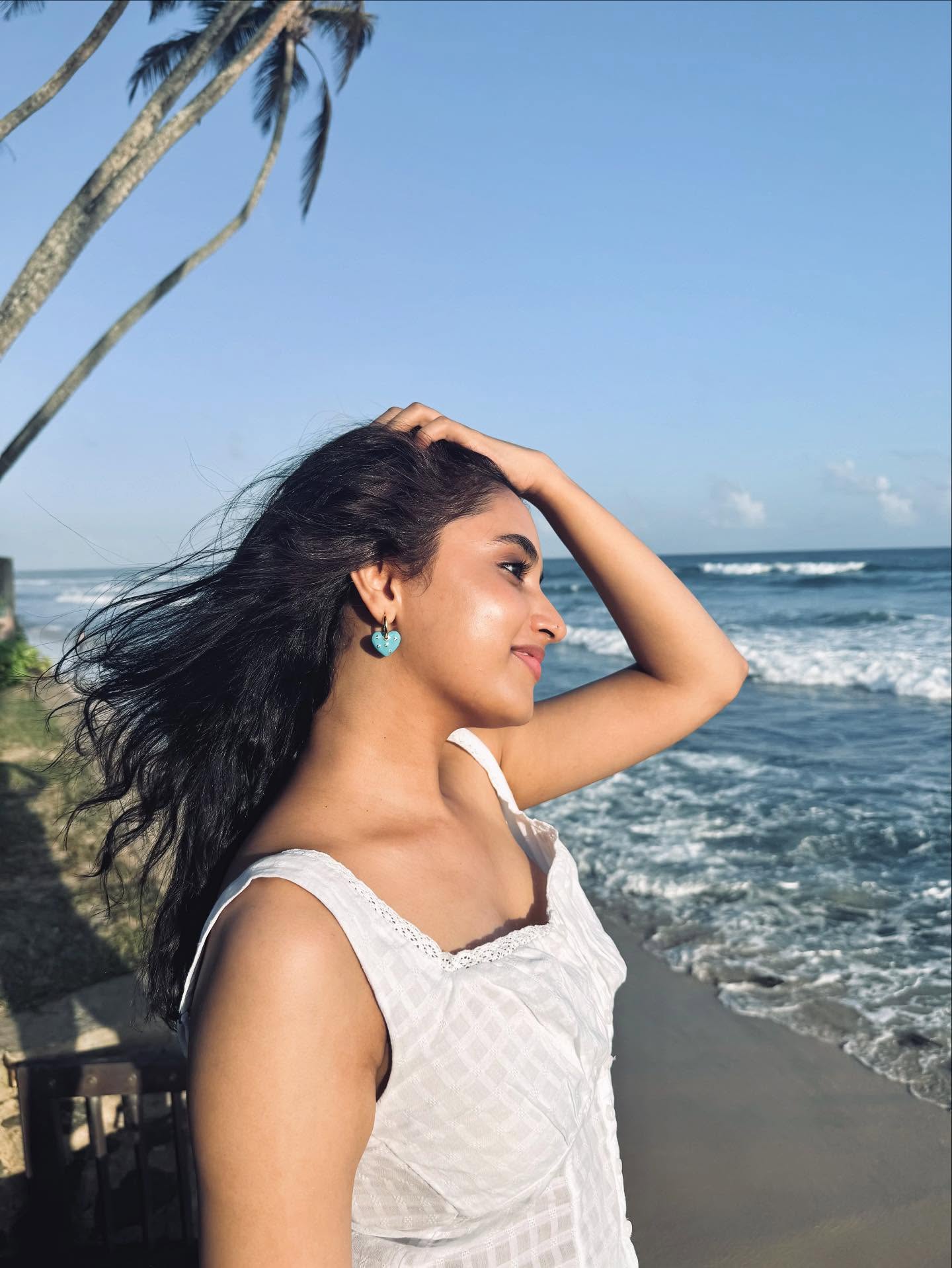 A single turquoise earring adds a daring pop of color, reflecting the ocean’s depth and her love for eclectic, nature-inspired accessories. It’s bold, playful, and effortlessly chic.
