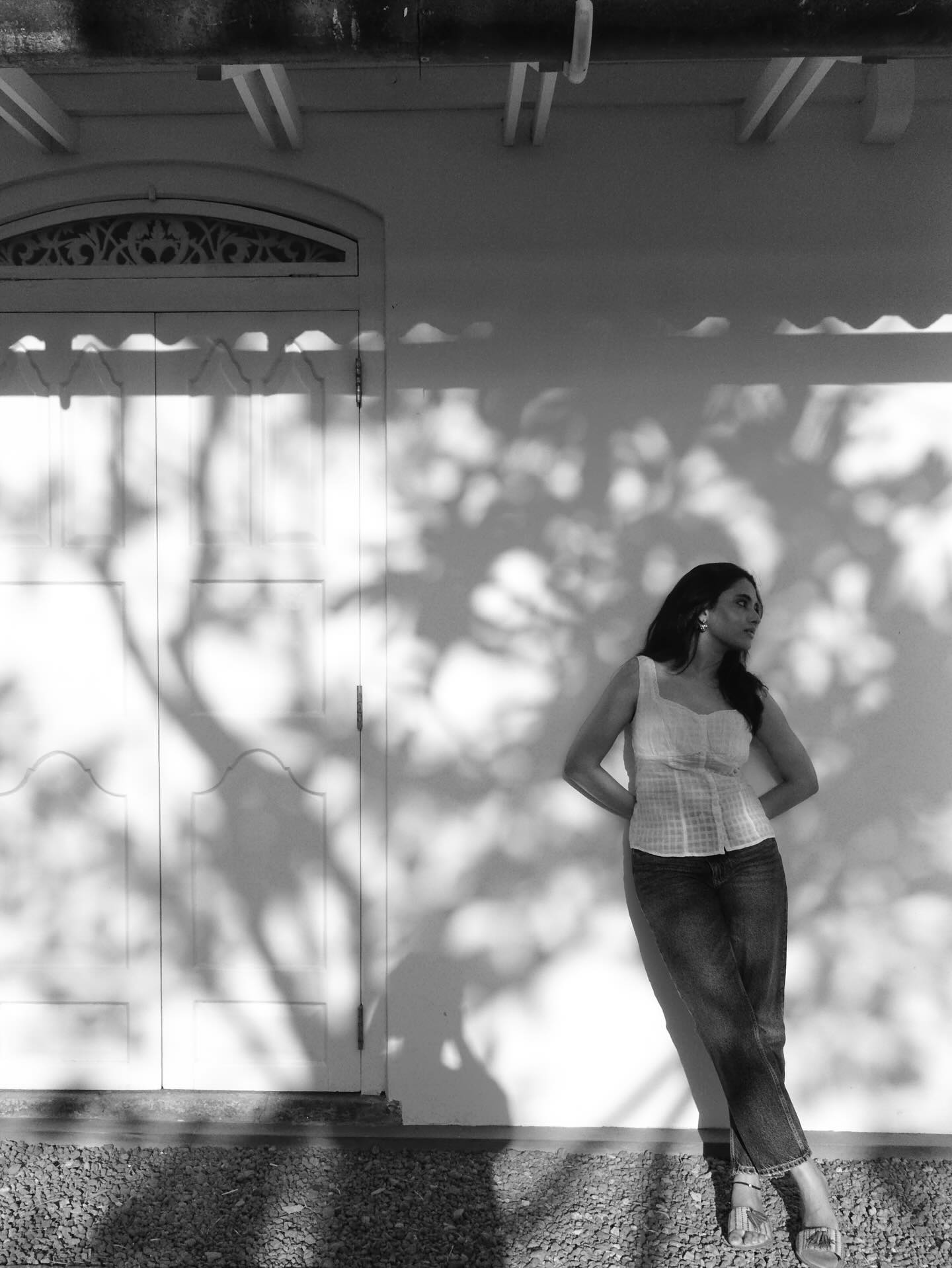 Her dark, wavy hair cascades in the breeze, untamed yet strikingly elegant. Each movement adds drama, creating the perfect frame for her contemplative expression.