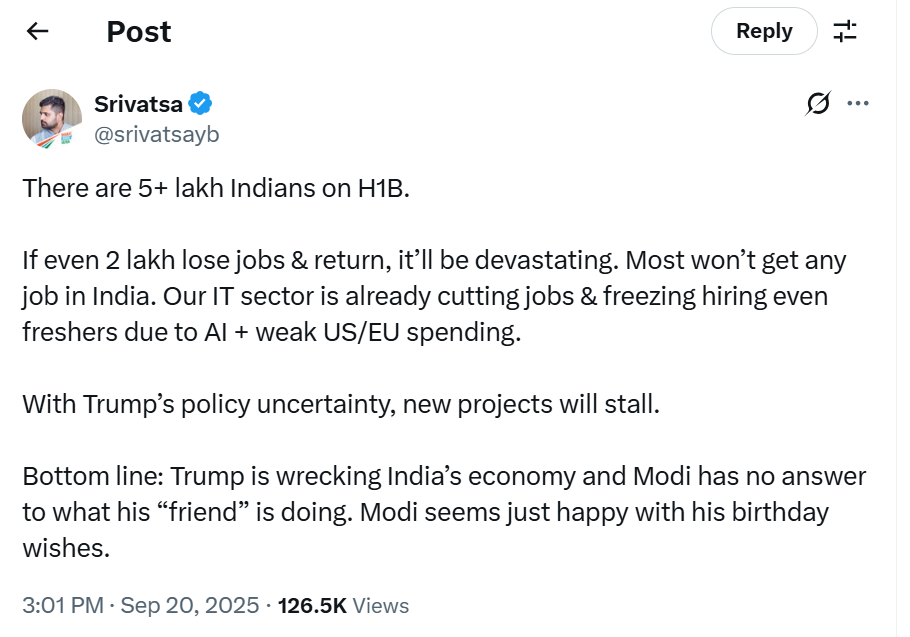 This isn’t just about H1Bs. It’s about India’s complete lack of preparation for a global tech reset. While trump is bulldozing indian jobs, Modi is still busy collecting birthday wishes. The question is simple: Who will rescue 2 lakh families when their dreams crash-land back in India?