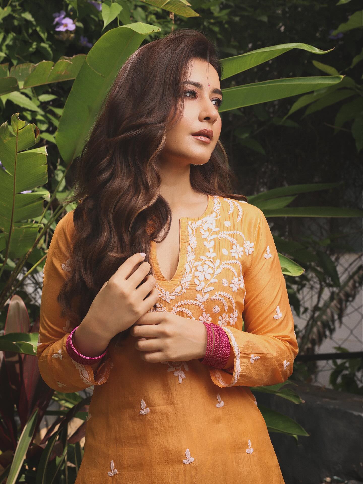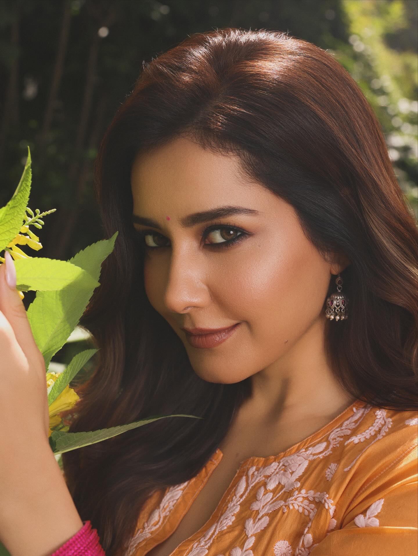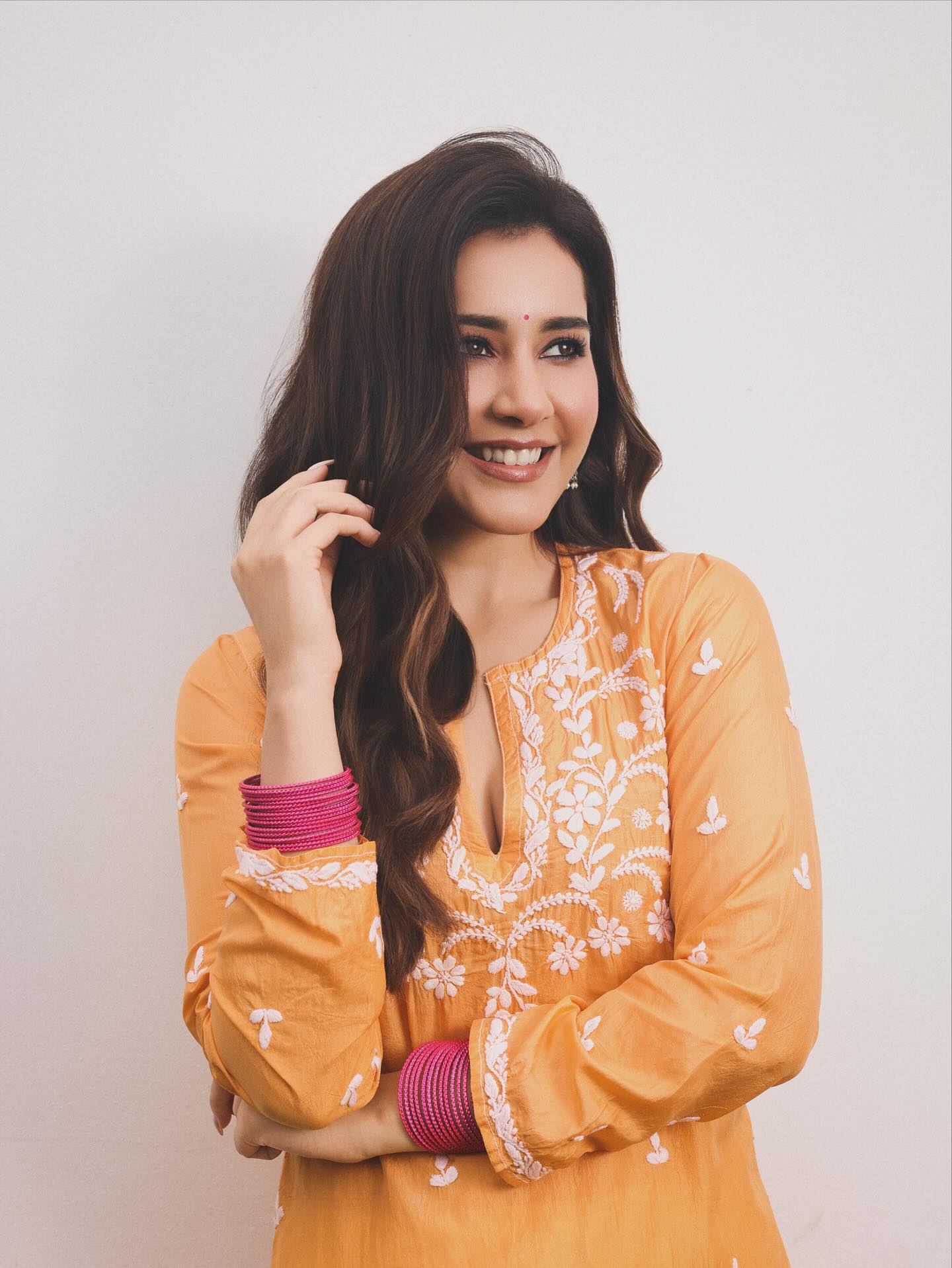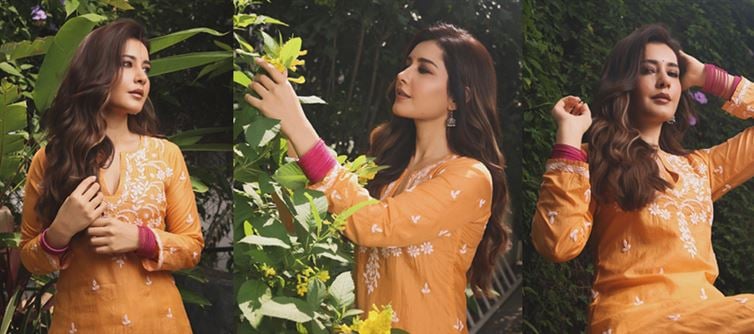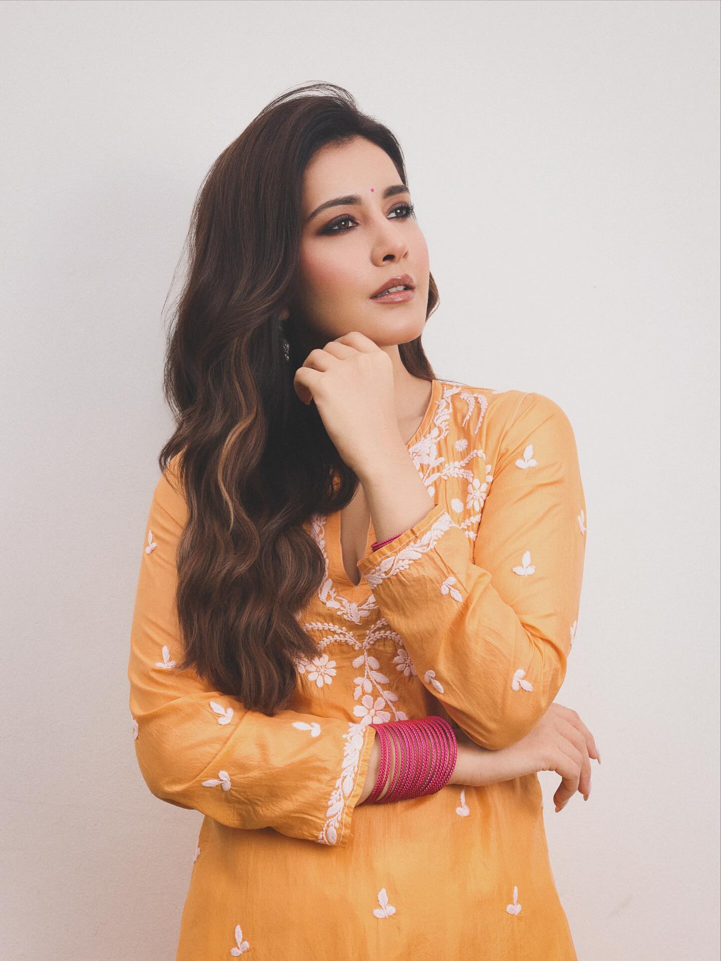 Raashi Khanna has done it again. With her upcoming romantic comedy Telusu Kada, she shared a fresh set of pictures that set social media ablaze. Known for mixing sexiness with simplicity, Raashi turned a traditional outfit into a scroll-stopping style statement. A bright orange kurta, delicate floral embroidery, and subtle ethnic touches proved once more that you don’t need over-the-top glam to make fans swoon.