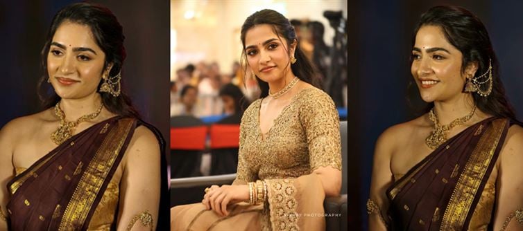 At the trailer launch of Kantara Chapter 1, Rukmini Vasanth didn’t just walk in—she became a living masterpiece. Draped in a deep maroon silk saree with golden edges, she radiated effortless grace and poise. Every movement, every detail of her ensemble—from the shimmer of silk to the gentle sway of her jhumkas—felt like a story unfolding, blending tradition with modern elegance. Onlookers couldn’t help but be captivated, as Rukmini turned a red-carpet moment into an unforgettable display of style, culture, and presence.