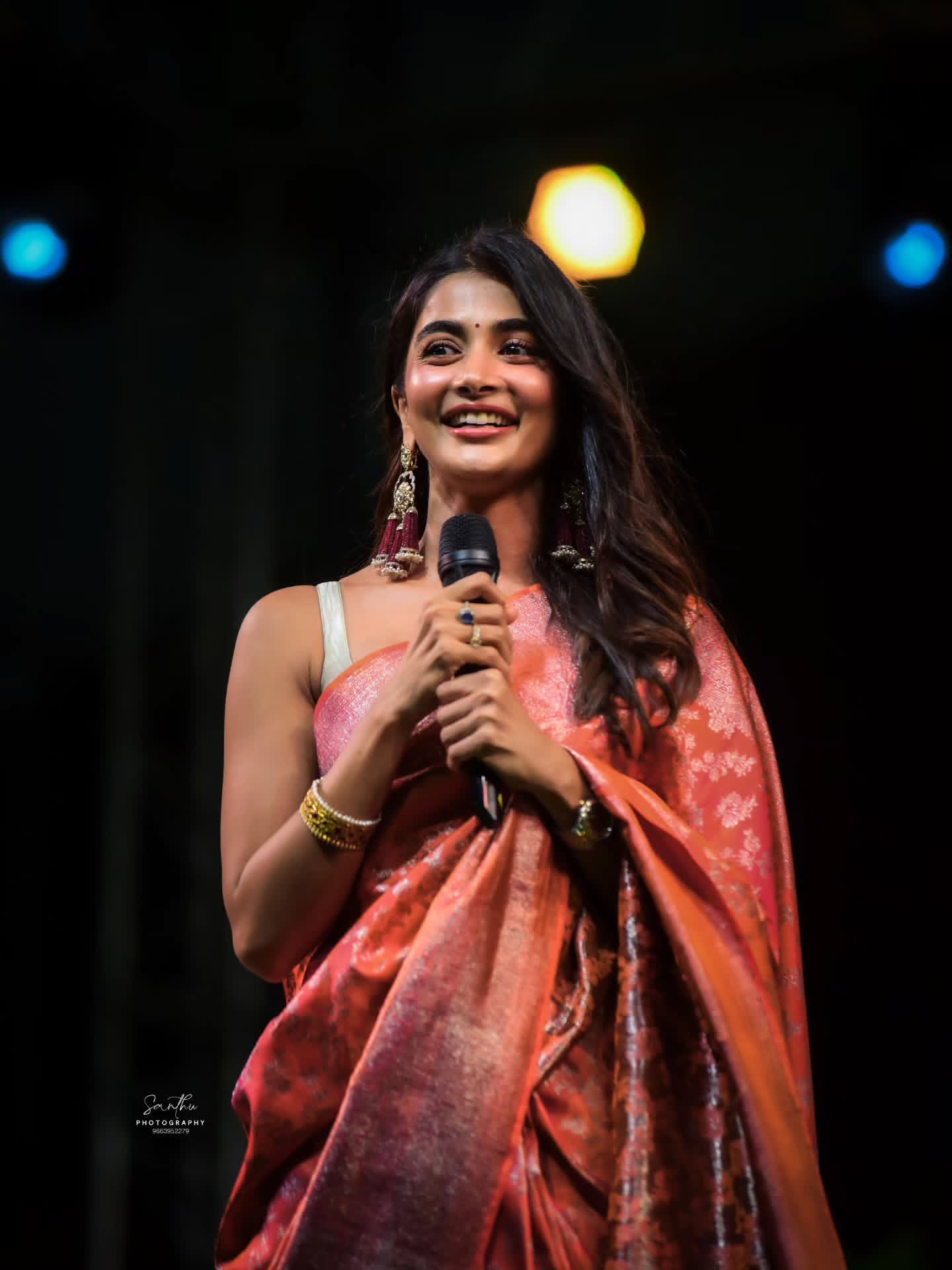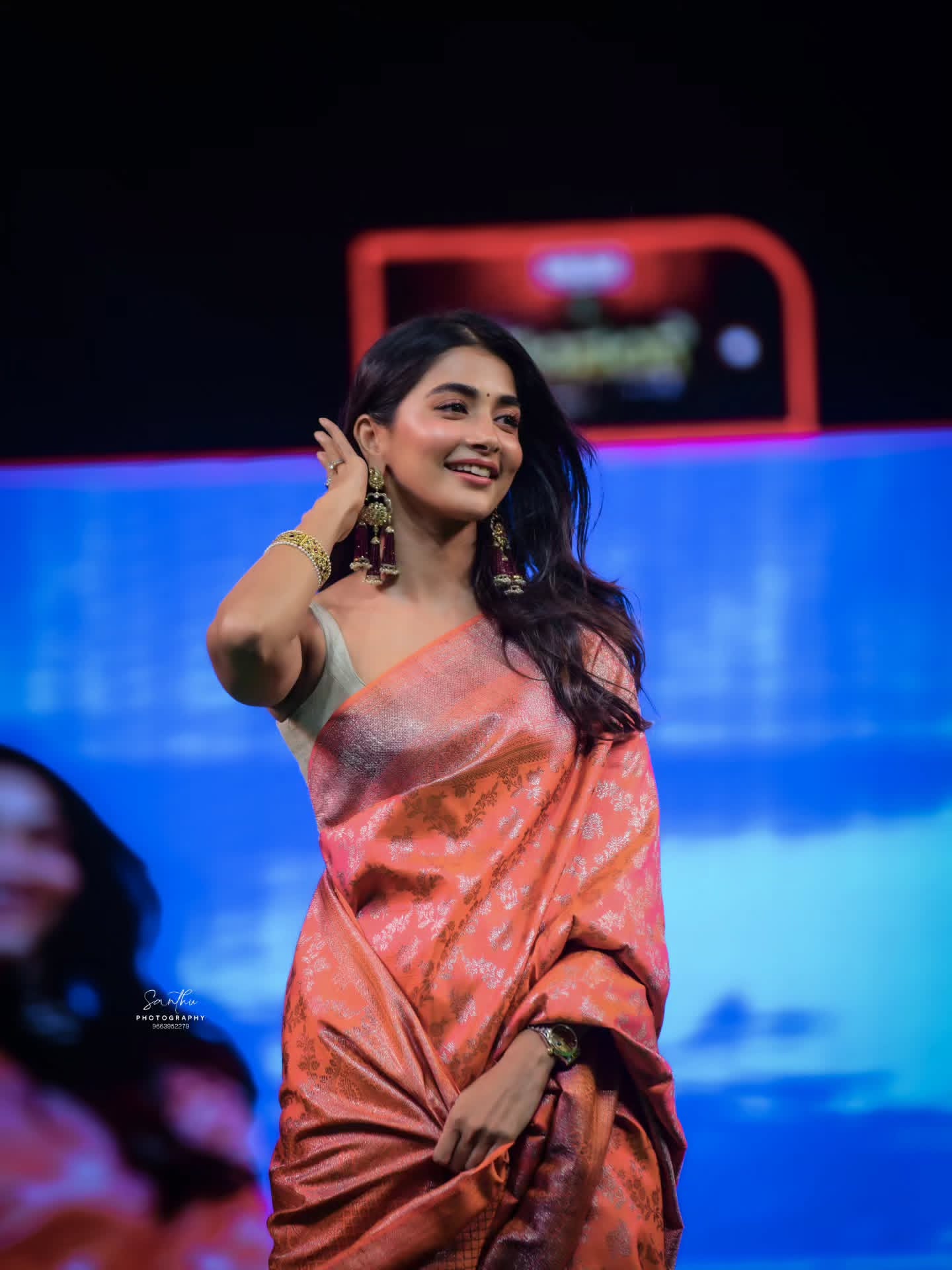 Under amber stage lights at Mangalore’s Karavali Utsav Grounds, pooja hegde embodies festive sophistication at the 10th edition of Pilinalike Celebrations. Draped in a peach-pink silk saree adorned with shimmering zari floral motifs, she transforms the traditional nine-yard drape into a canvas of opulent elegance, perfectly resonating with the Navratri and dasara festivities.