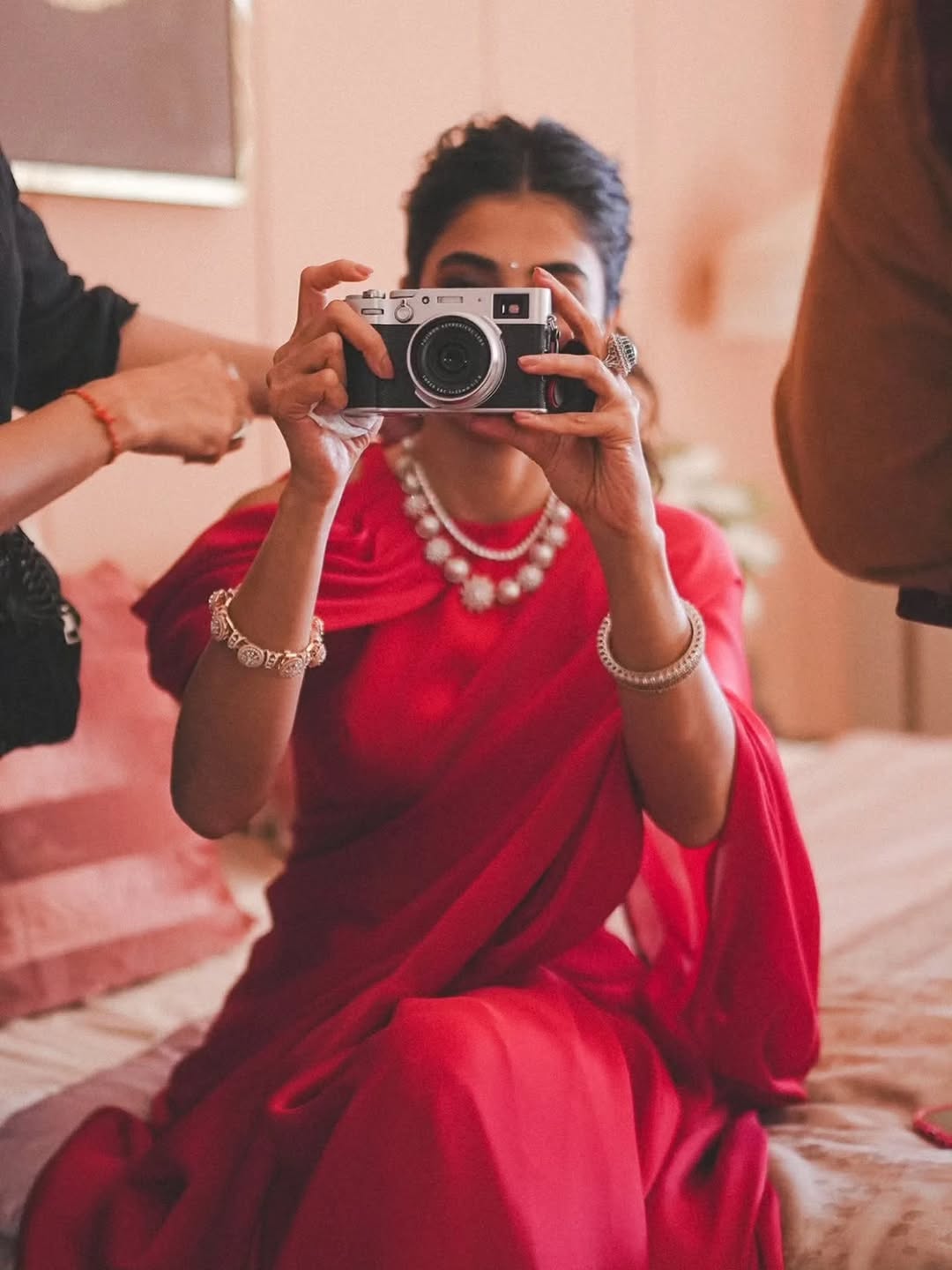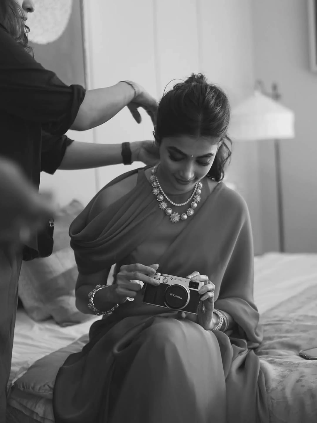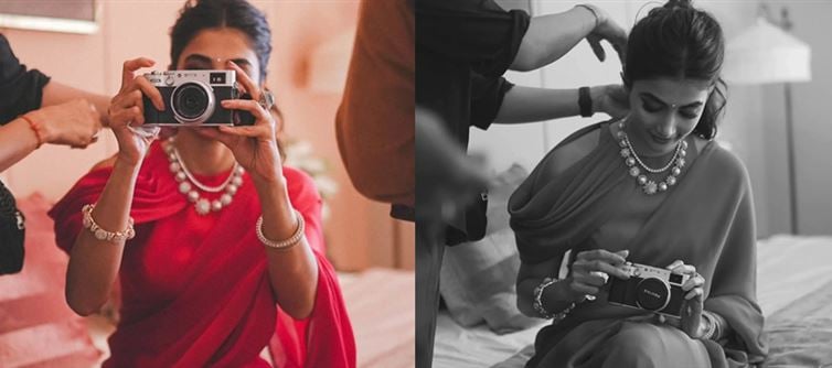 Clutching a vintage camera, pooja merges her love for photography with her sartorial choices. The focused expression hints at a creative soul behind the glamour, turning a simple fashion moment into an intimate, lifestyle-inspired editorial. It’s storytelling through style — a portrait of personality, not just attire.