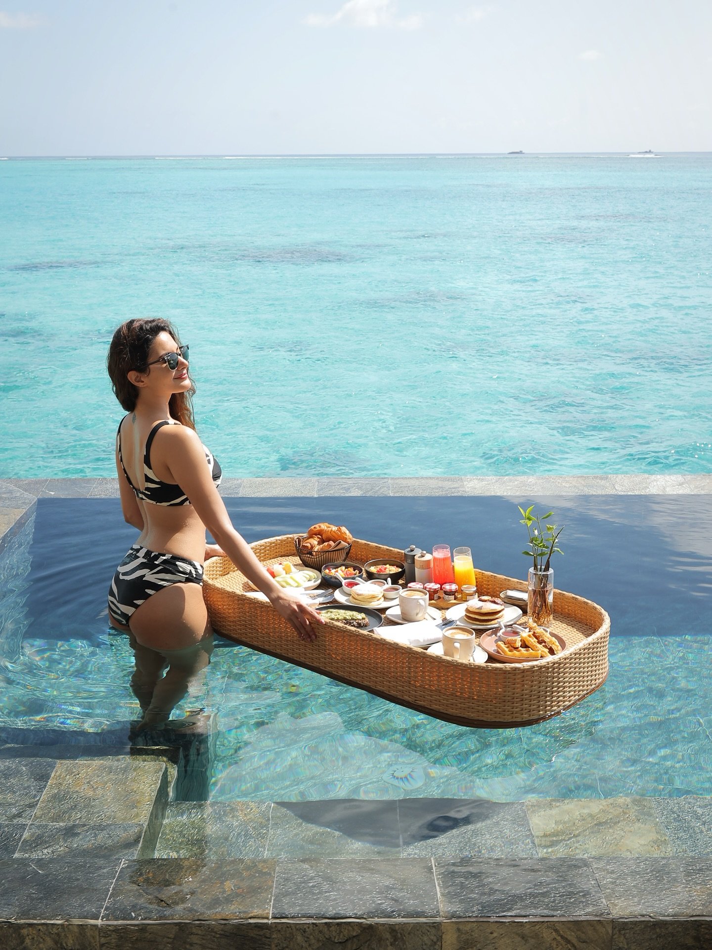 While most of india battles monsoon chills, amyra dastur is serving summer glam straight out of a postcard. Standing in the crystal-clear waters of the Maldives, she effortlessly blends carefree holiday vibes with bold style, turning a floating breakfast scene into a lesson in minimalist elegance. From her zebra-print monokini to her loose, sun-kissed hair, every detail is a masterclass in summer chic.