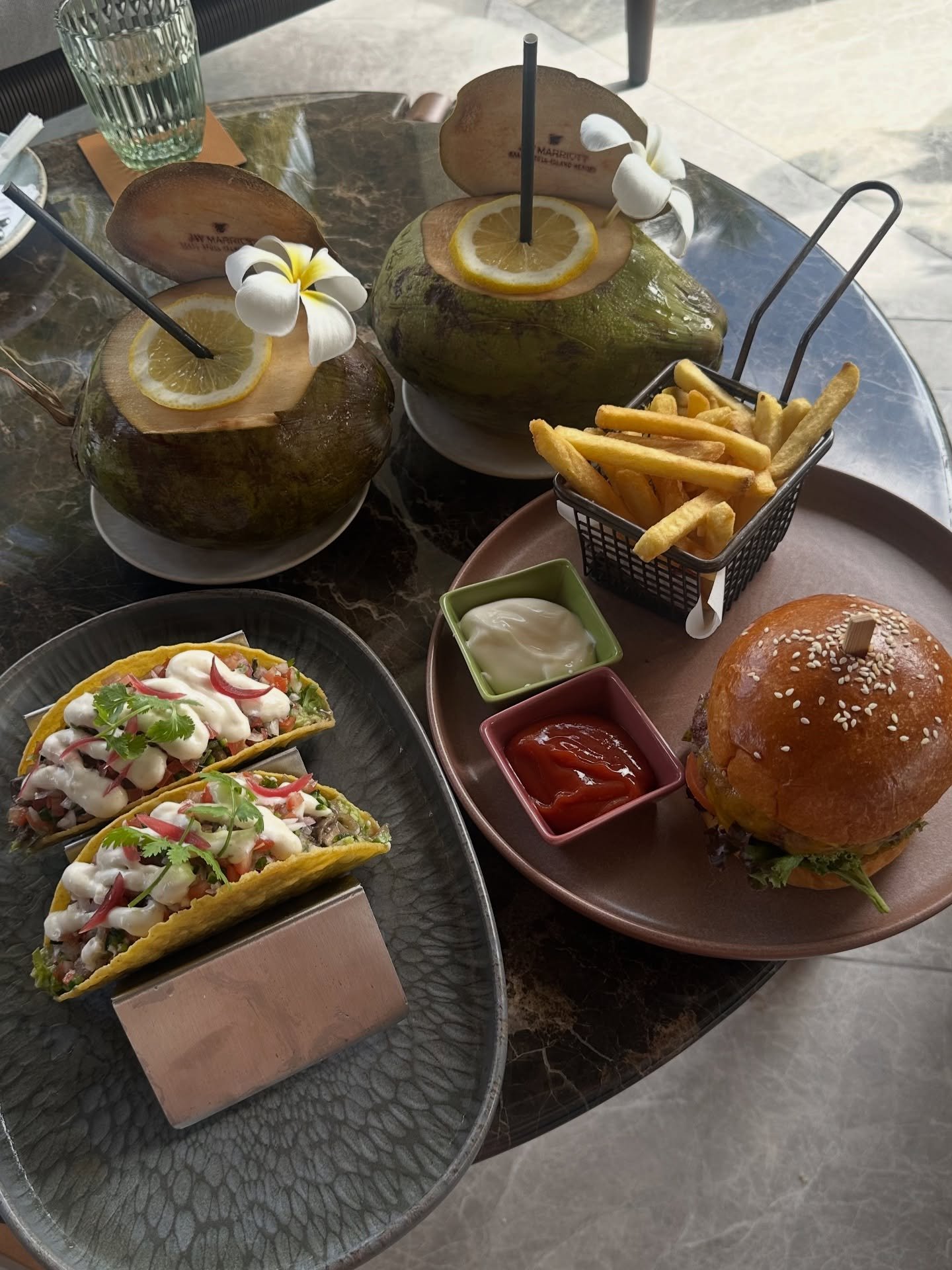 The scene features a woven tray floating nearby, laden with fruits, coffee, pancakes, and juices. It’s not just food—it’s a props-as-style statement, enhancing the serene, sunlit tableau.