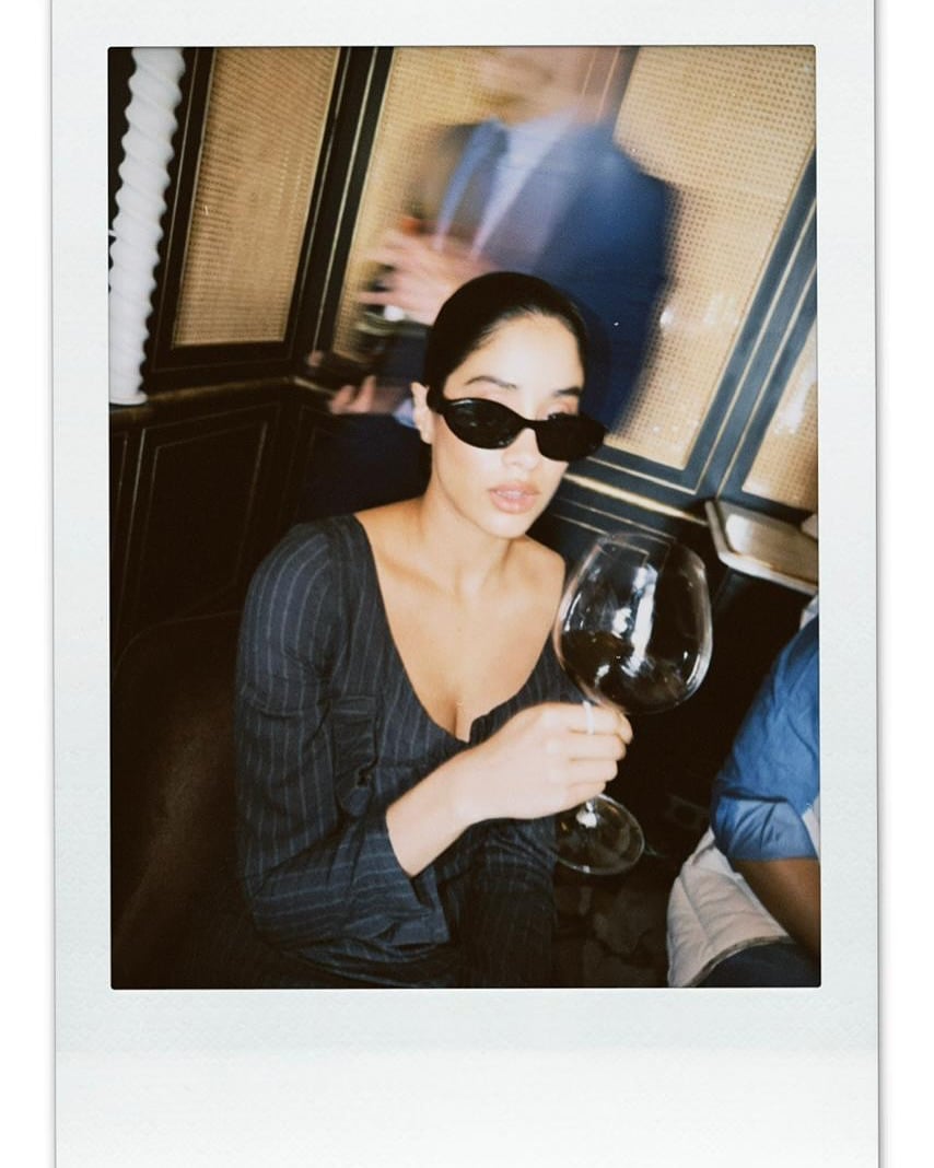 Minimalism met sophistication: a vintage bag, delicate diamond earrings, and dark sunglasses created layers of subtle opulence, proving less is truly more when the outfit speaks volumes.