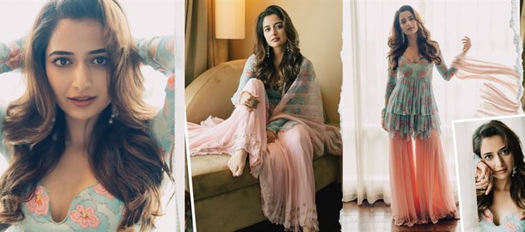 Ashika’s light blue full-sleeve mini top is a study in subtle elegance. The peach floral embroidery adds a soft, feminine touch that contrasts perfectly with the structured silhouette, creating a balanced, eye-catching ensemble.