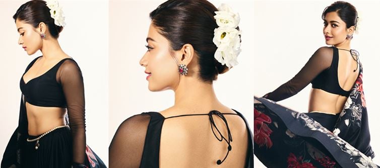 Rashmika’s choice of an all-black saree is the perfect blend of simplicity and drama. The flowy fabric and clean lines make the outfit elegant, while the deep black tone evokes mystery and strength, perfectly aligned with her vampire-inspired character.
