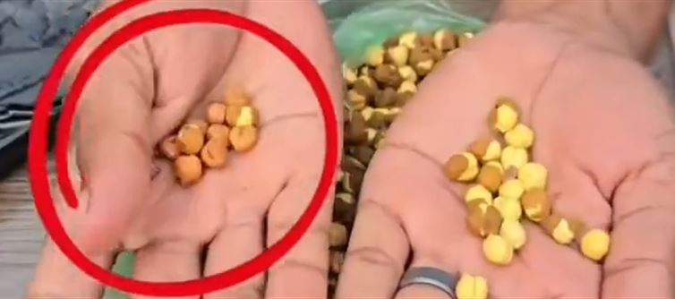 A presenter stands before two bags — one black, one green — both filled with roasted chickpeas. One looks dull, natural, and unassuming. The other, unnaturally bright and golden, glowing with what the presenter calls “poison in disguise.”