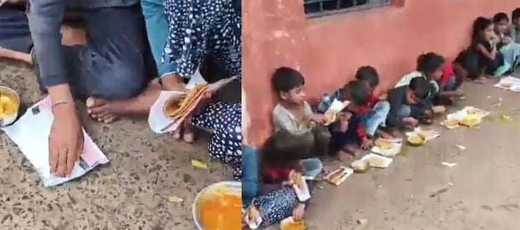 A group of children — barefoot, hungry, sitting on a dusty schoolyard in Madhya Pradesh’s Sheopur district. Their lunch? Served not on plates. Not even on leaves. But on scrap paper — torn, discarded, and spread across the ground like their dignity.