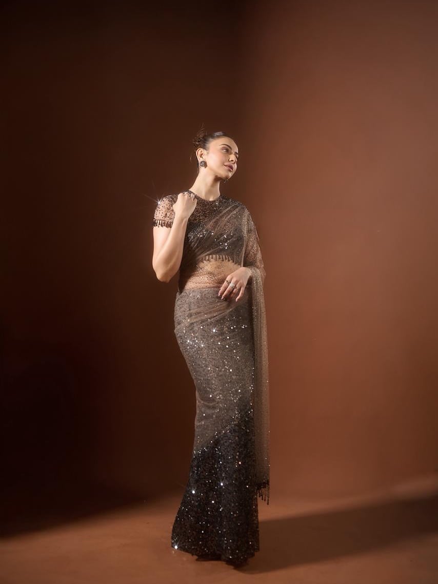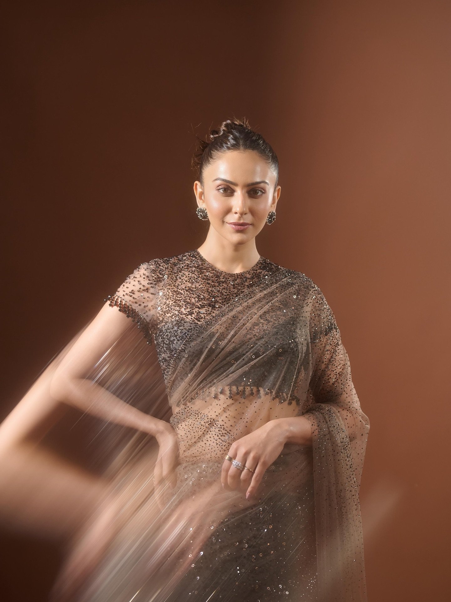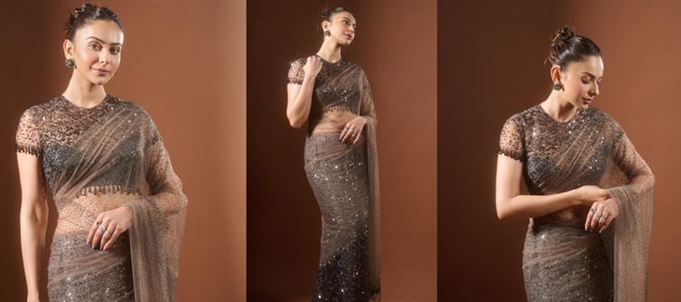 rakul preet singh didn’t just walk into the bigg boss 19 set — she floated in, draped in a breathtaking mocha brown-black sequin saree from the ateliers of Tarun Tahiliani. With every flash of the camera, she proved that the cocktail saree has officially entered its luxury couture era.