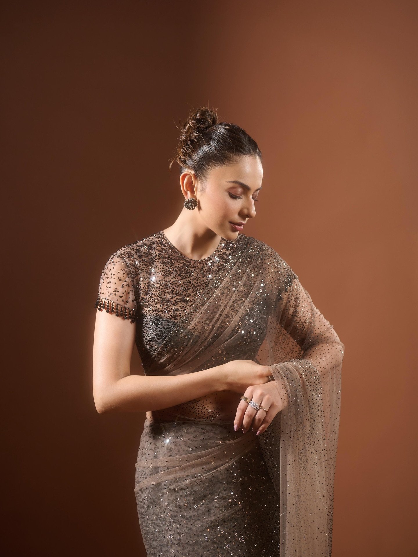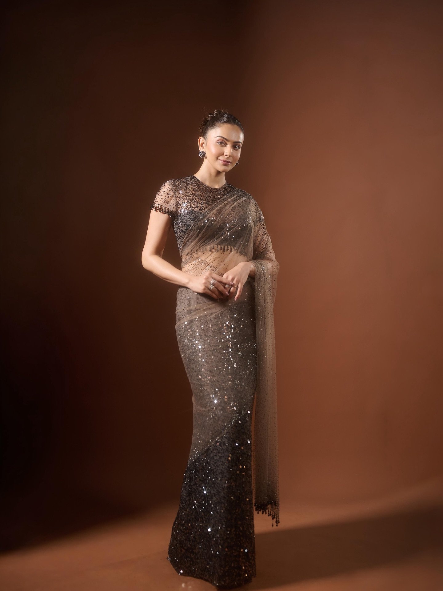 Crafted from fine, fluid fabric drenched in sequins, the Tahiliani masterpiece reimagined shimmer as sophistication. The saree’s chocolate tones melted into black hues, creating a molten metal illusion that caught the light from every angle.