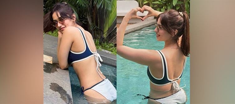Navy and white — a timeless pairing that feels nautical yet soft. Manushi’s bikini doesn’t rely on sequins or structured cuts; it’s the simplicity that does the heavy lifting. Clean lines, gentle curves, and that subtle contrast of color tell us that understated doesn’t mean unnoticed.