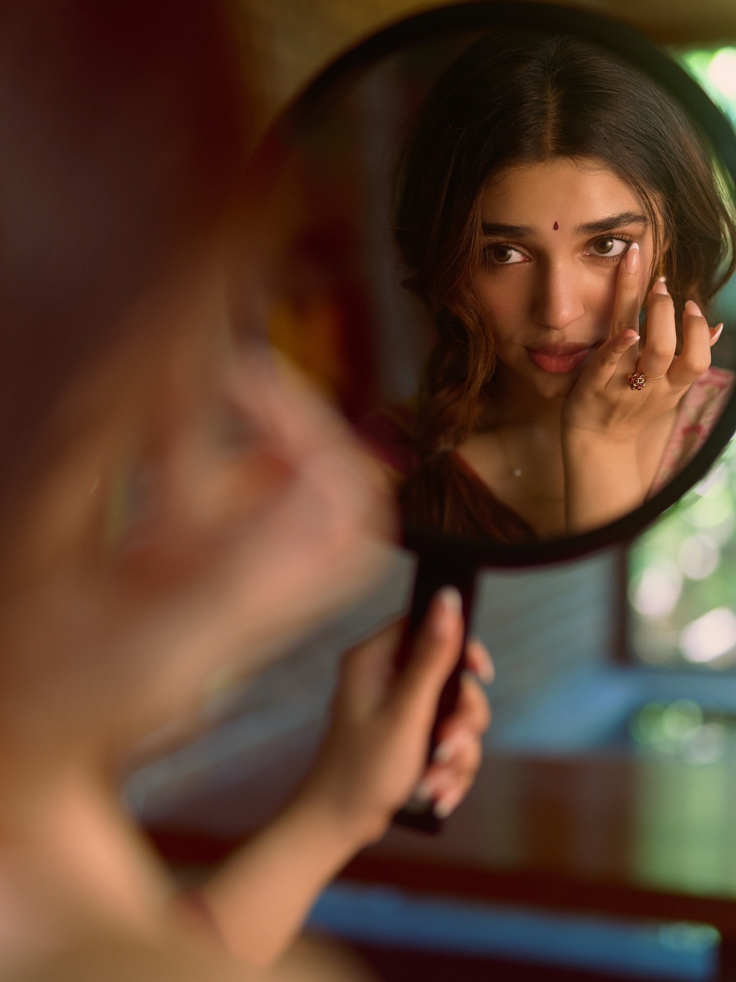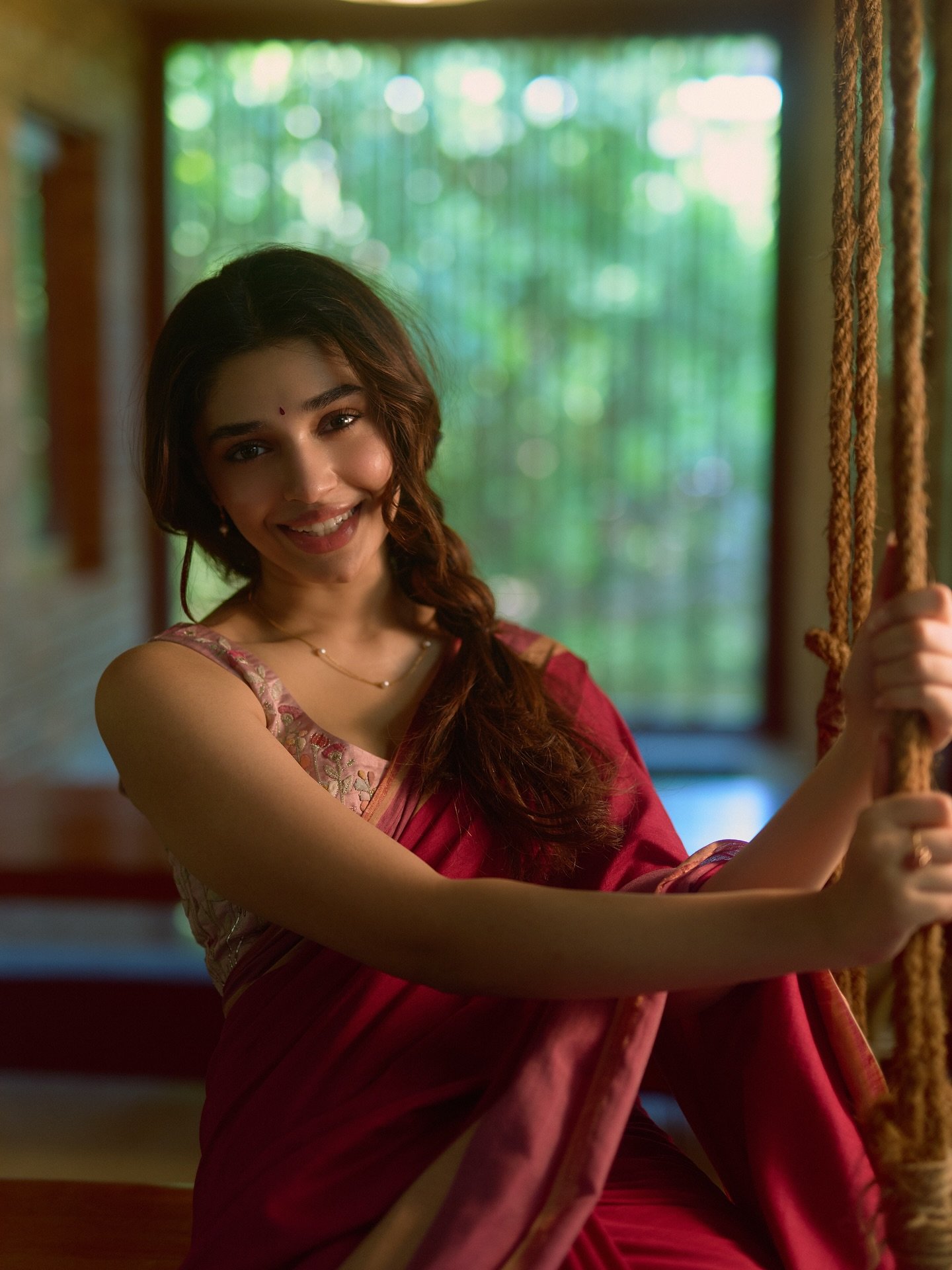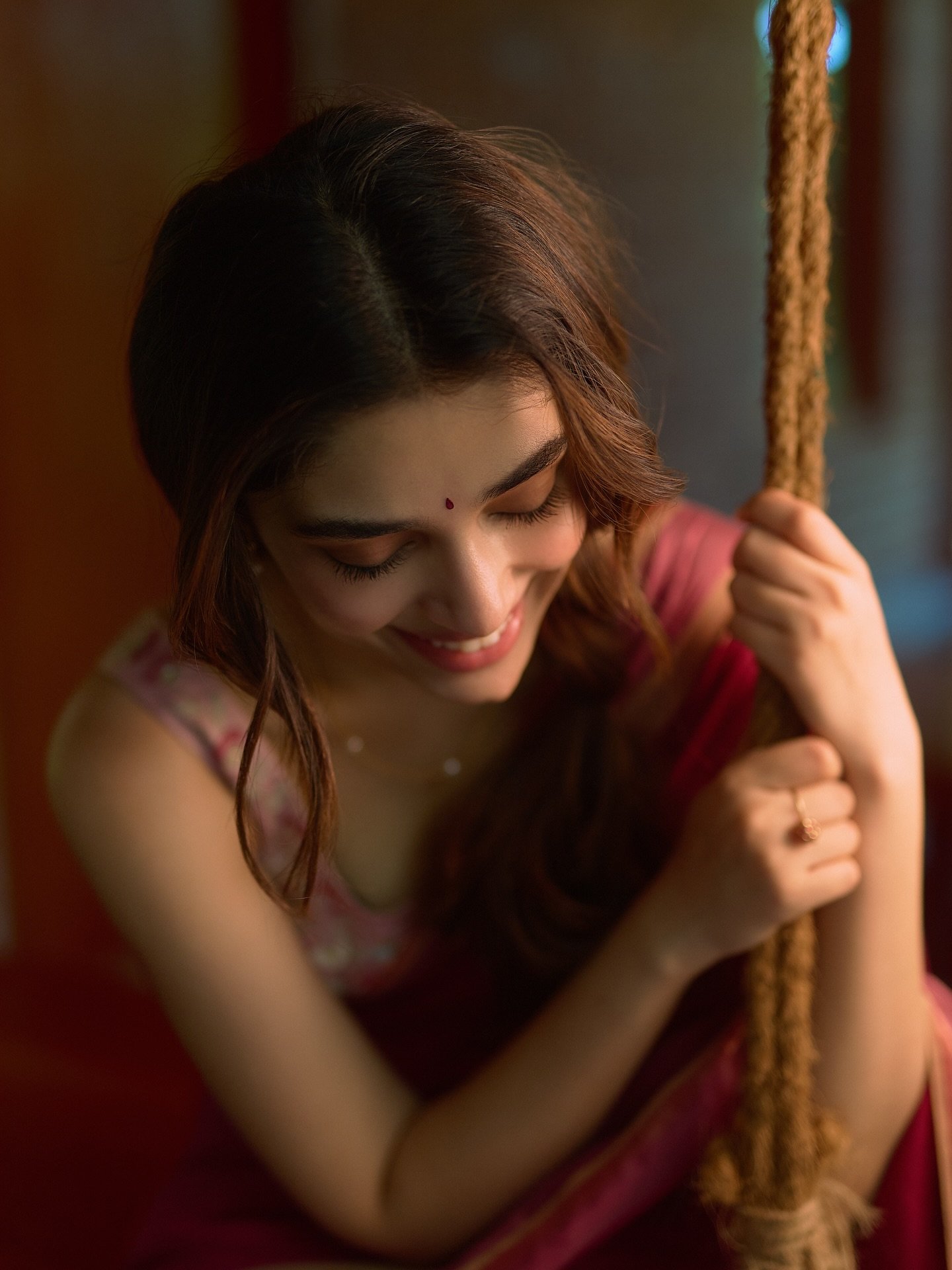 The internet was minding its own business until Kriti Shetty casually sat on a wooden swing in a red silk saree — and the entire mood of the day shifted. With a style so unforced, so quiet, and so impossibly pretty, she reminded us why soft femininity still rules the fashion kingdom. And just when we thought the visuals were enough, she’s pairing it with a christmas release that promises love, sci-fi, and Vignesh Shivan’s signature chaos.