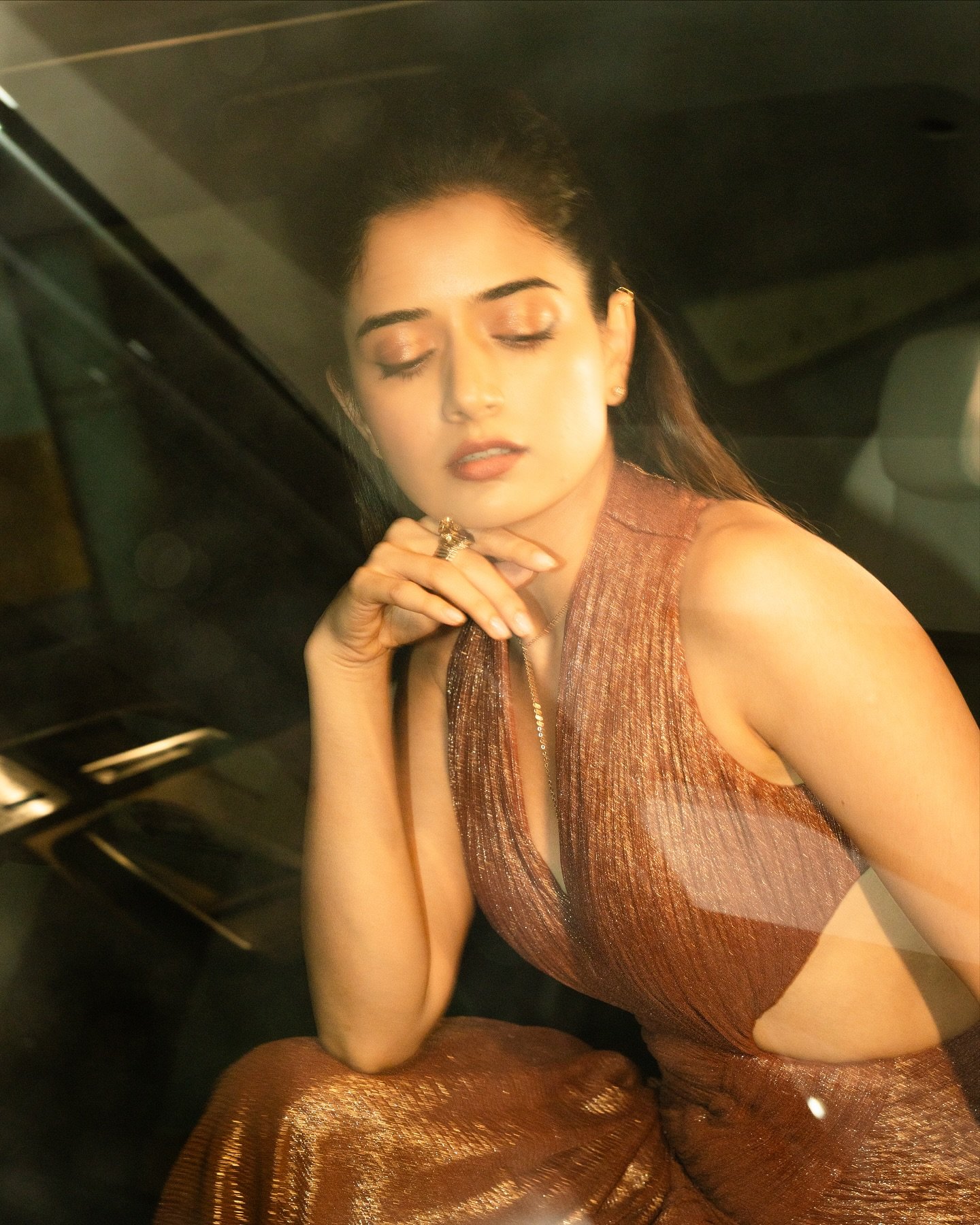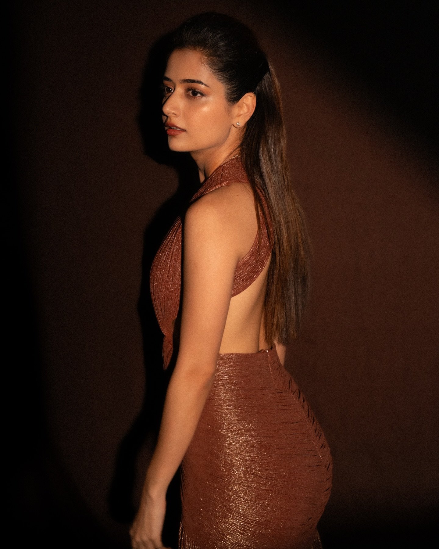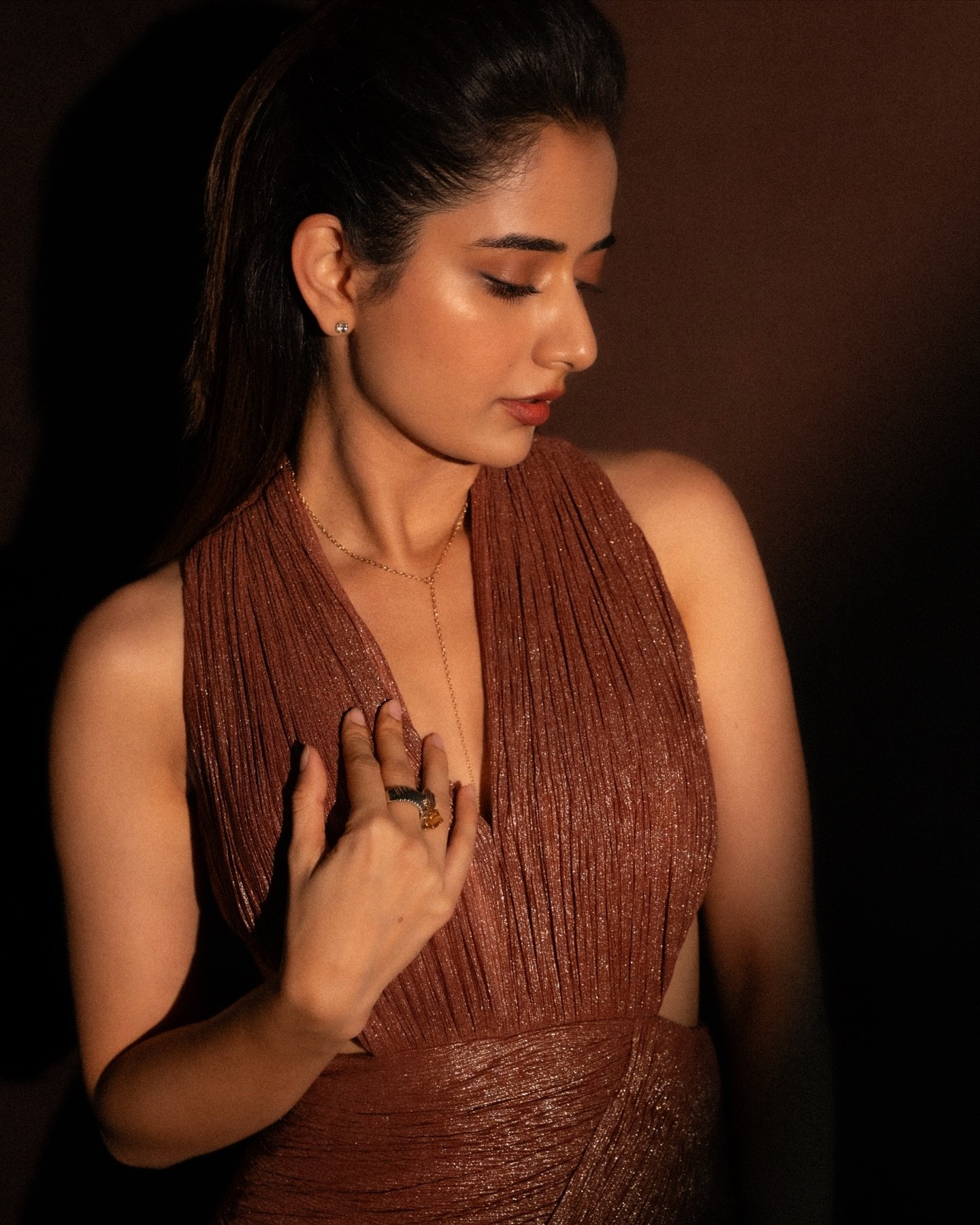 The gown isn’t just bronze—it’s molten warmth poured into fabric. It hugs her silhouette, catches every stray beam of light, and moves like liquid luxury.