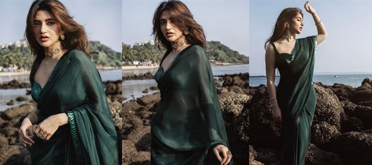 It was a quiet moment on a goa beach, wrapped in a deep green saree, standing on a rock like she had nowhere to be and nothing to prove.
