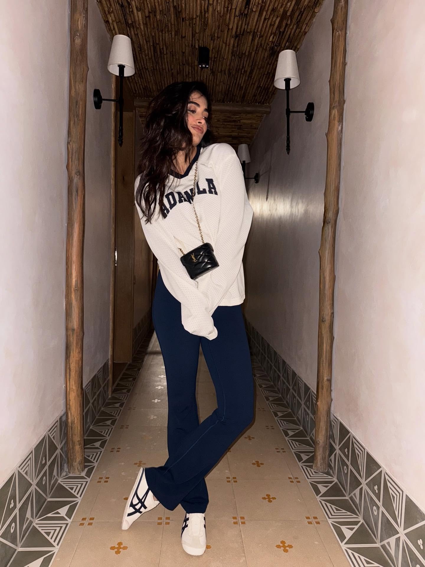She pairs the oversized top with clean, body-contouring navy leggings that bring the silhouette into perfect balance.