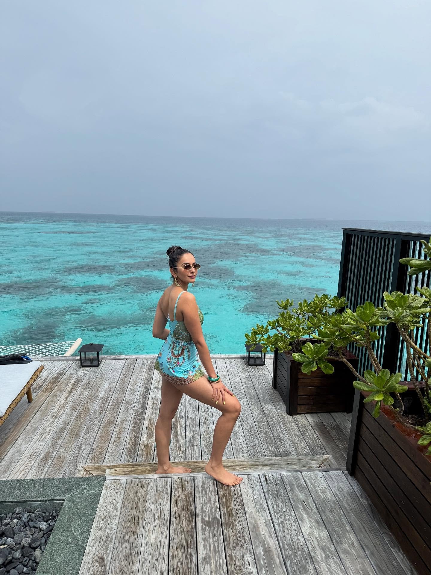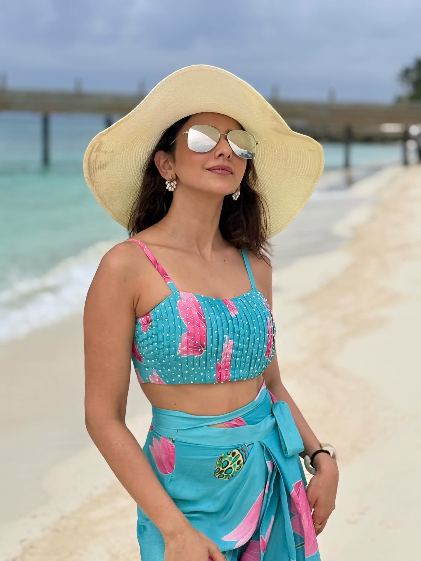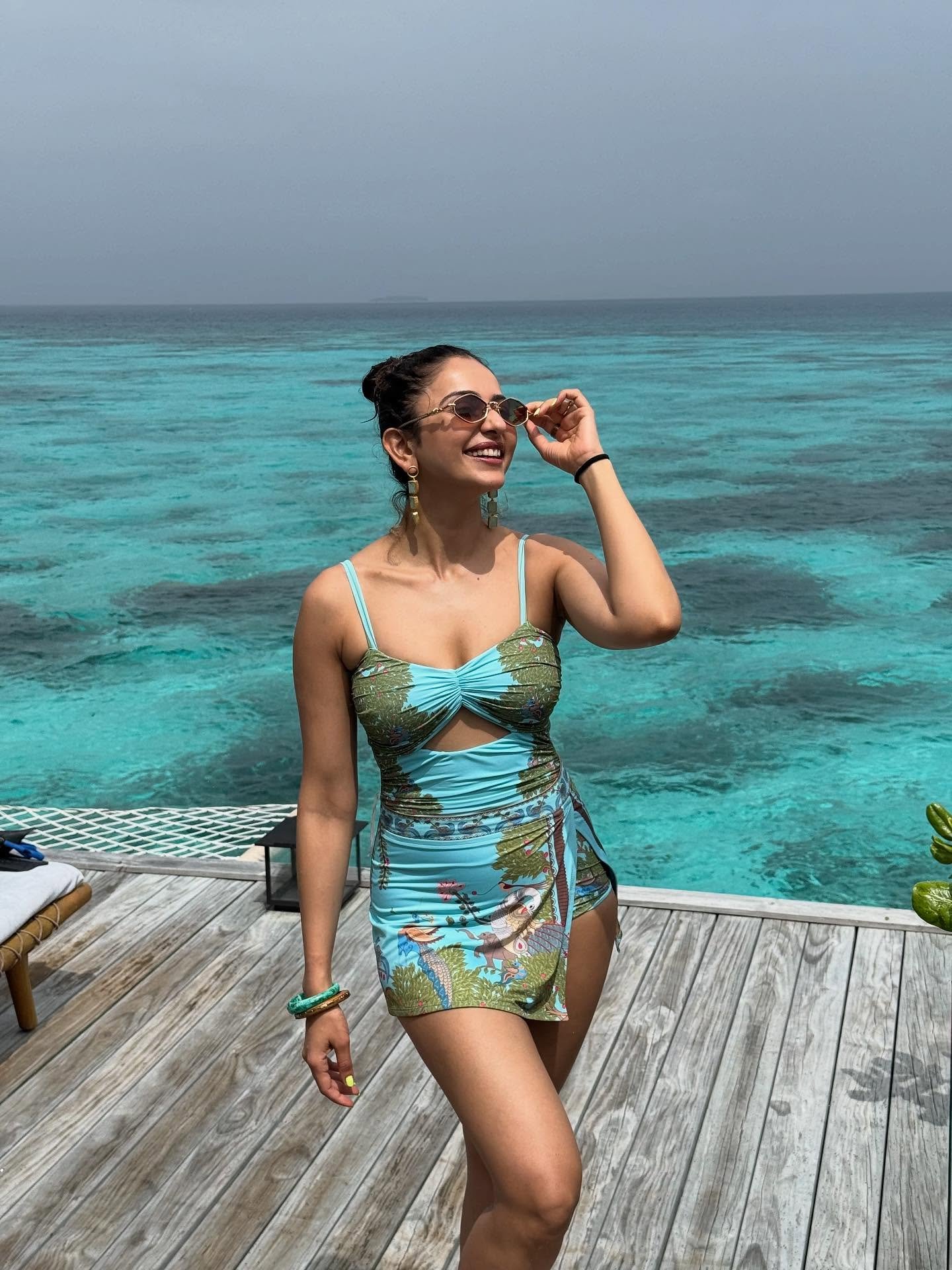 The Maldives has always been a celebrity favorite, but rakul turns it into her personalized campaign backdrop: serene, pastel, quietly cinematic.