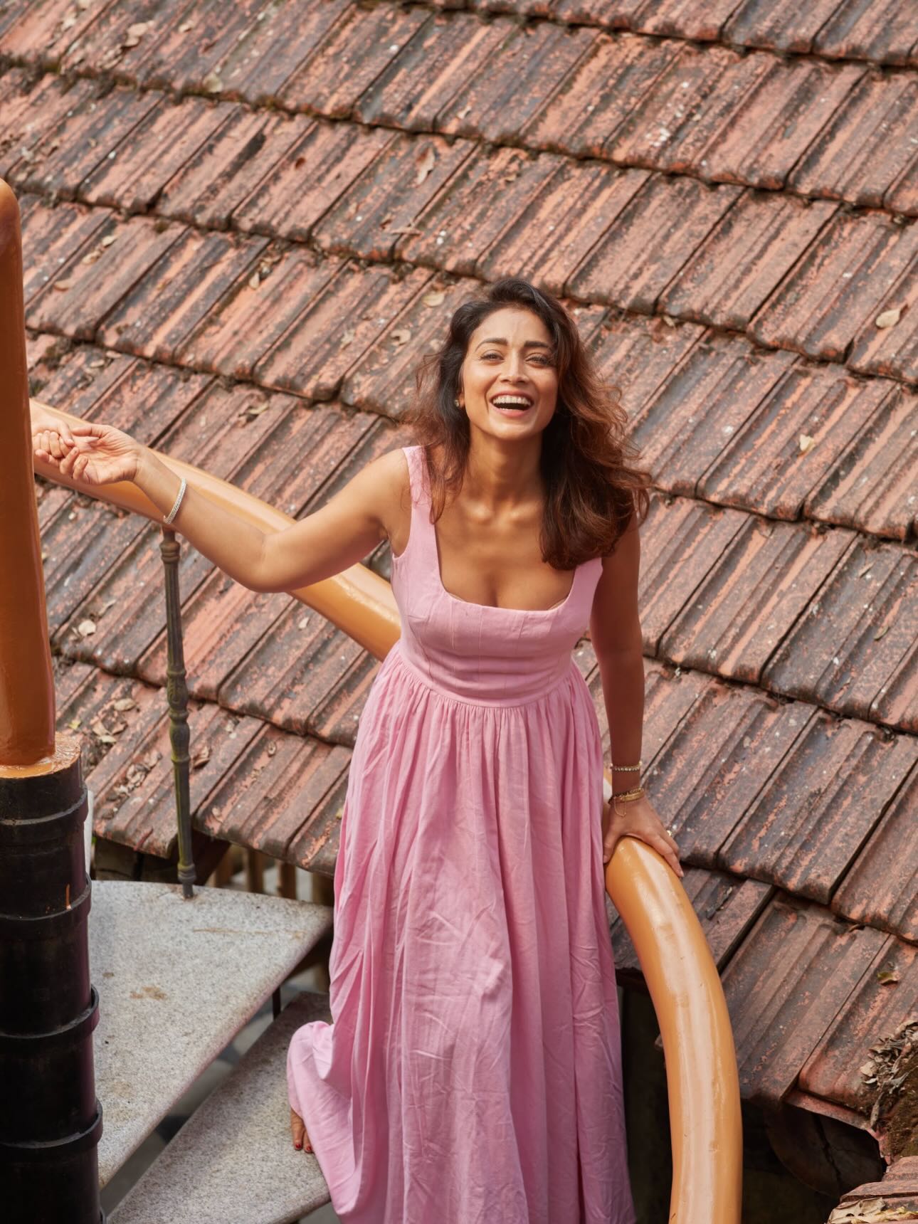 Just as Shriya toggles between emotional arcs and dance-driven roles, her fashion shifts between earthiness and glamour. Her outfits here mirror that duality — softness wrapped around shimmer, simplicity wrapped around bold choices.