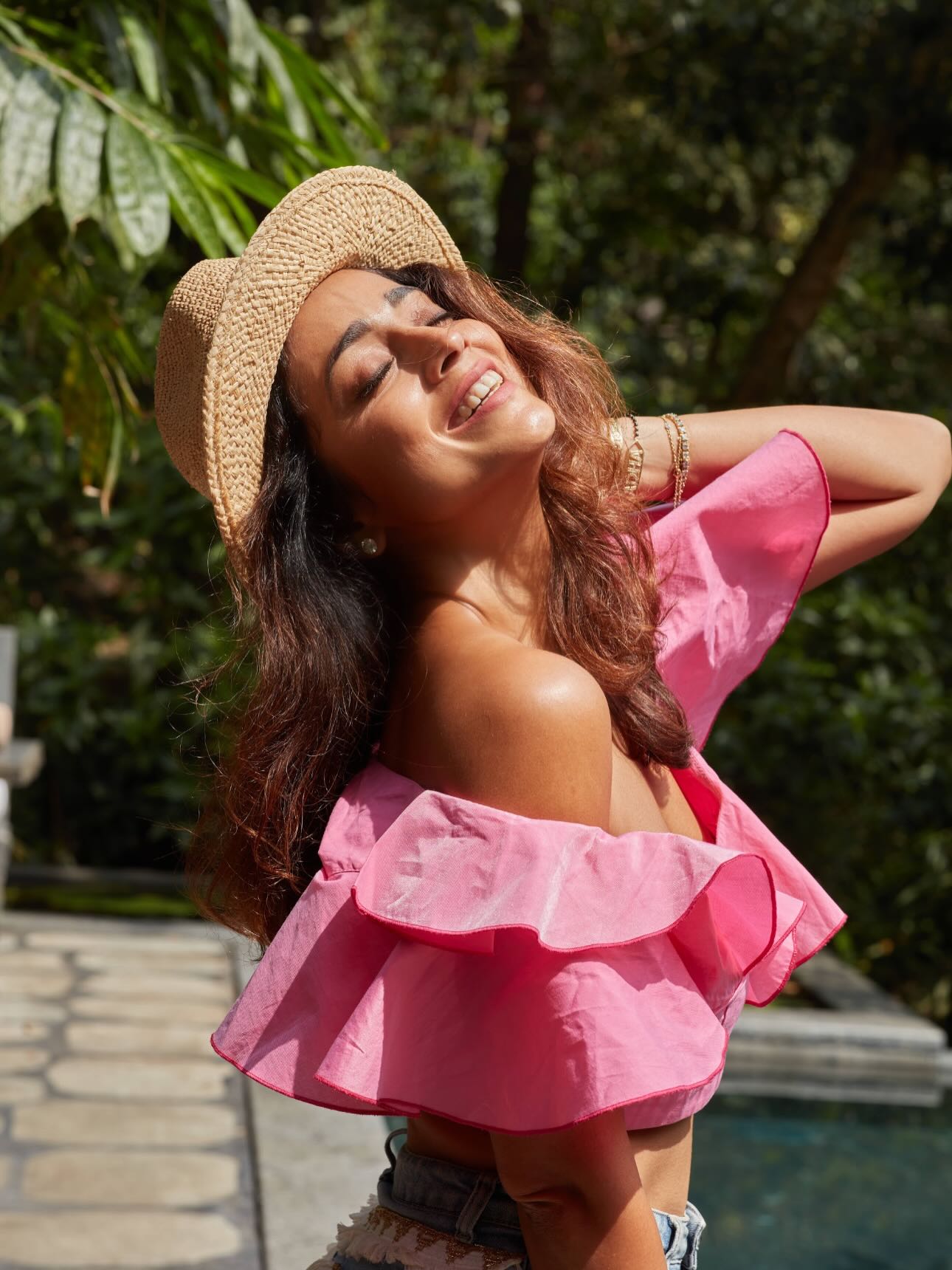 The loose pink shrug draped over her bikini adds the perfect counterbalance. It softens the vibrancy of the lime while adding movement and texture. It’s the kind of piece stylists call “effort magic” — throw it on and suddenly the whole frame feels intentional.