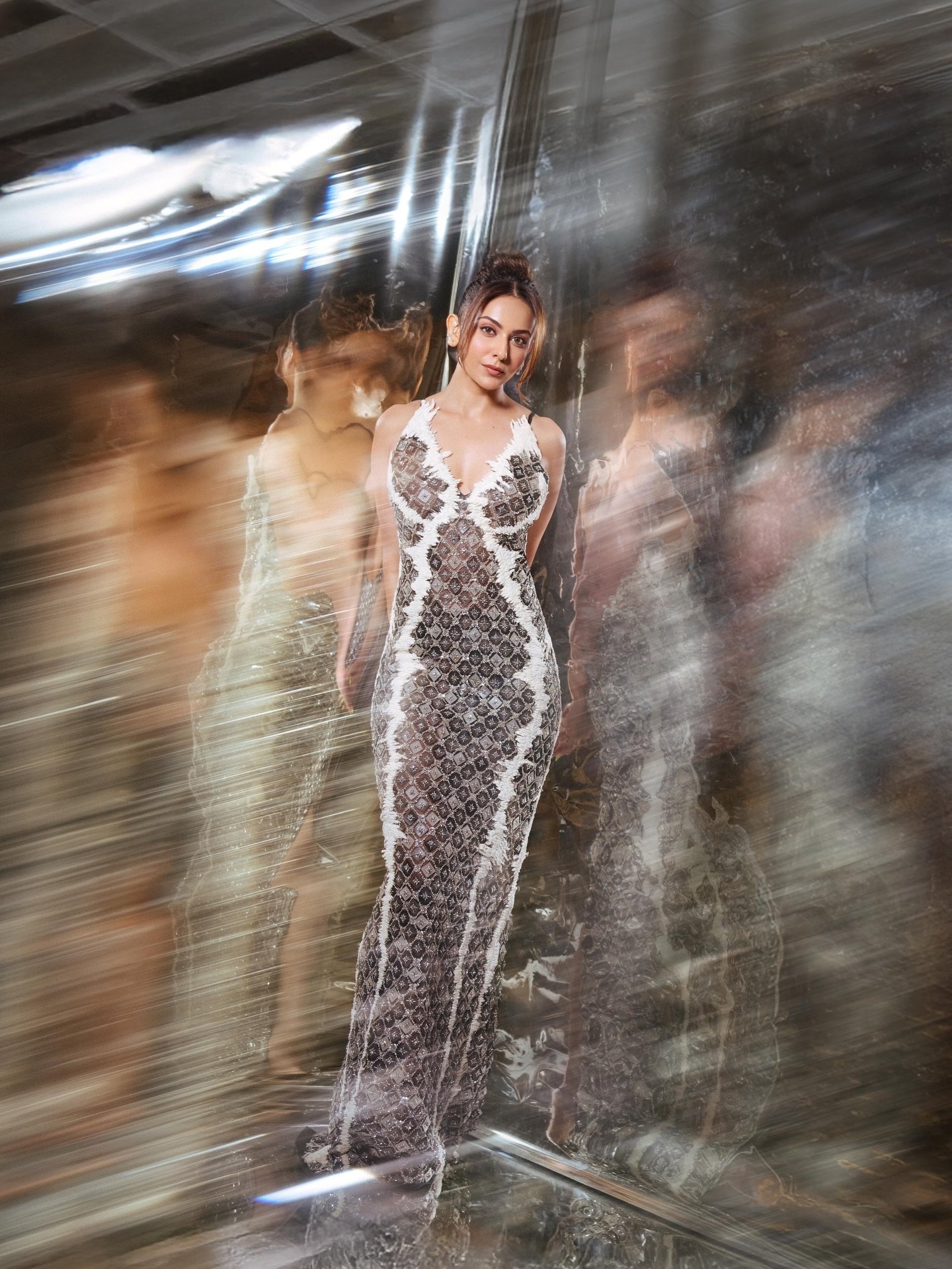 There’s a surreal softness in the frames — as if rakul stepped through a glossy mirror and kept the distortion on her skin.