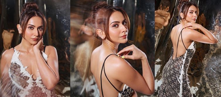 Sleek, sculpted, and unapologetically clean — Rakul’s top bun is a masterstroke in modern red-carpet minimalism.