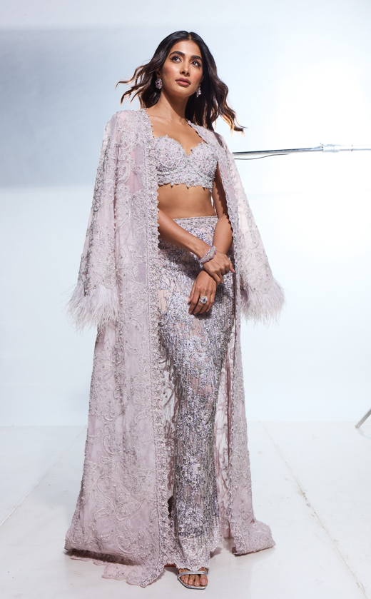 pooja Hegde’s lavender dream is not just an outfit—it’s a masterclass in contemporary ethnic dressing. With feathers, crystals, and couture-level confidence, she proves once again that true style lies in evolution, not repetition.