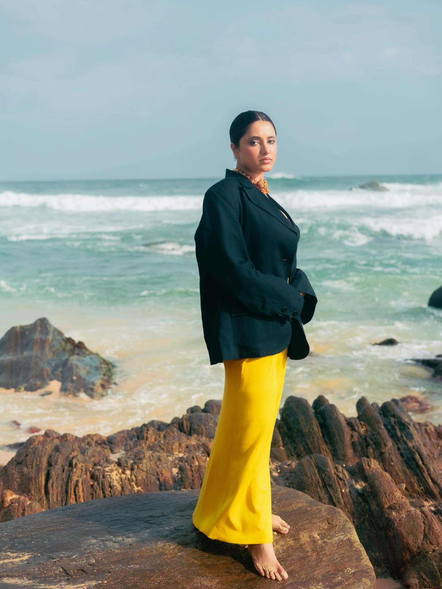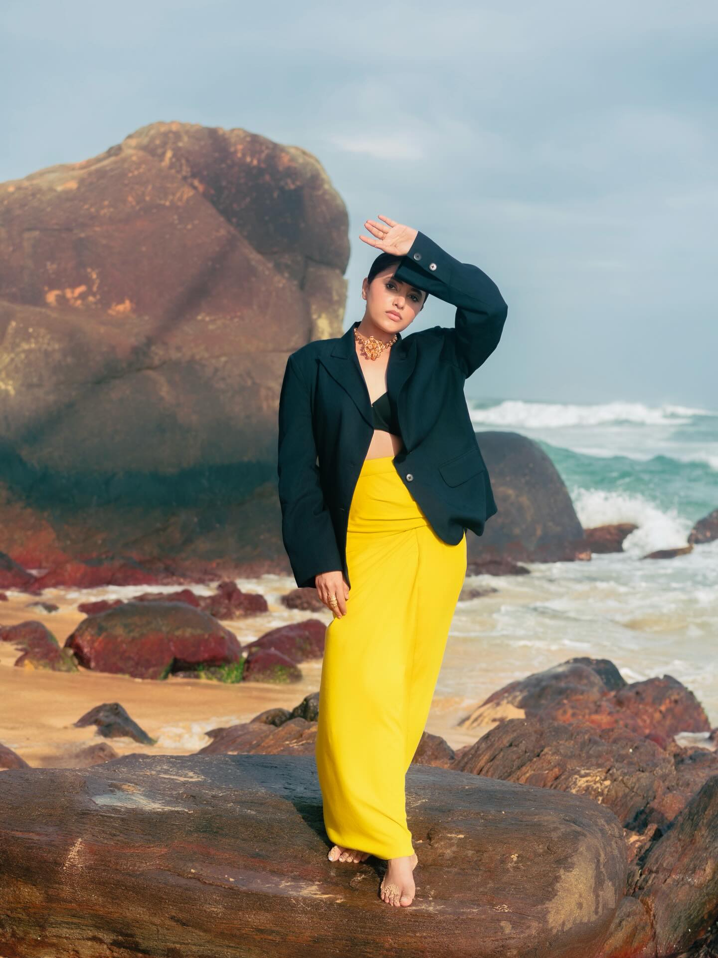 That twisted yellow skirt softens the look instantly. Fluid, sunlit, and gently dramatic, it offsets the sharpness up top. The result? A silhouette that moves with the breeze while staying firmly in control. fashion loves contrast—and this one lands beautifully.