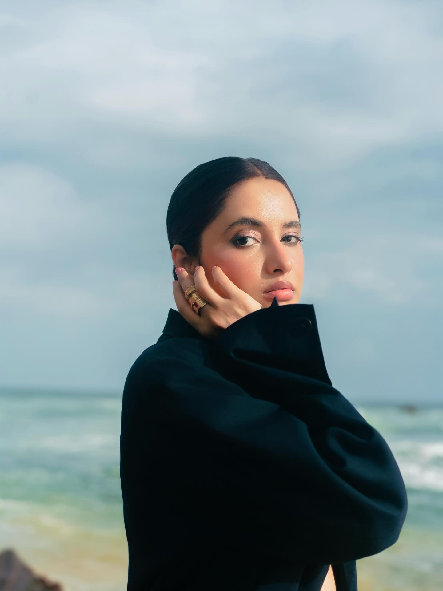 Rocks. Waves. Open sky. No props needed. The coastal setting strips away distraction and lets the outfit breathe. It feels spontaneous, almost accidental—like she just stepped out, paused, and owned the frame.