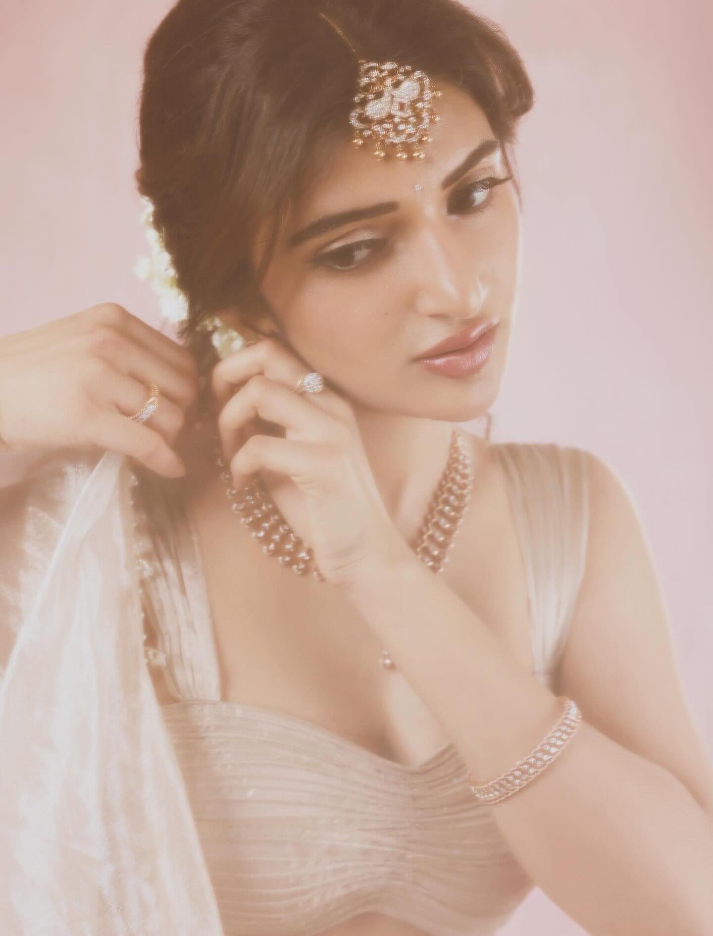 The accessories tell the same story. A delicate necklace. Matching earrings. A subtle maang tikka that adds tradition without tipping into excess. Her low ponytail, finished with fresh white flowers, channels old-school grace with modern ease.